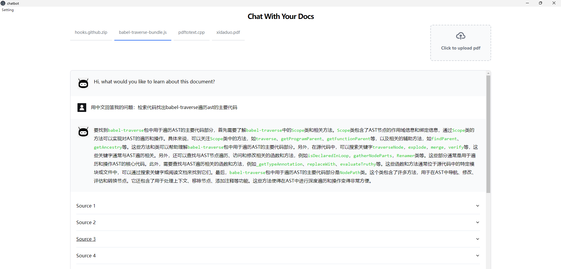- 本地缓存: 应用将对话历史本地缓存,以便用户随时查看过往互动,支持多文档。