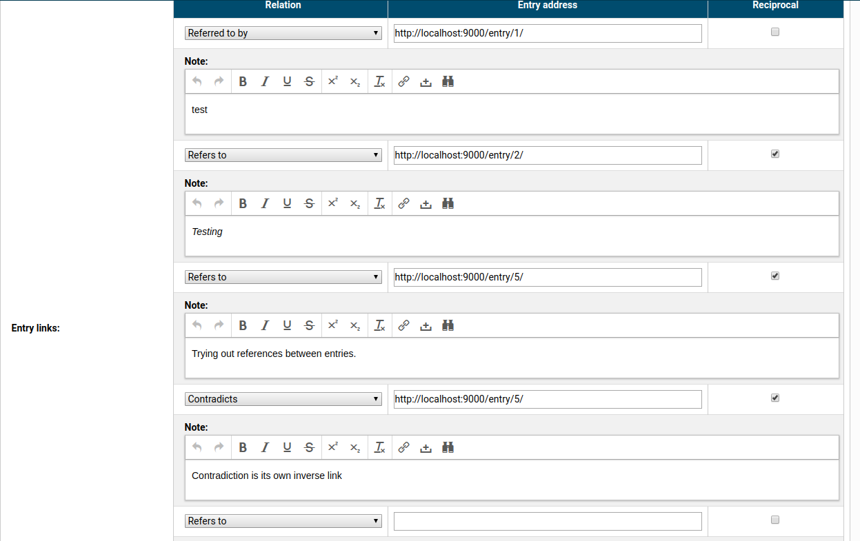 The editing experience looks like this and as you can see it allows for specifying that a link is reciprocal, which automatically generates the corresponding link in another entry: