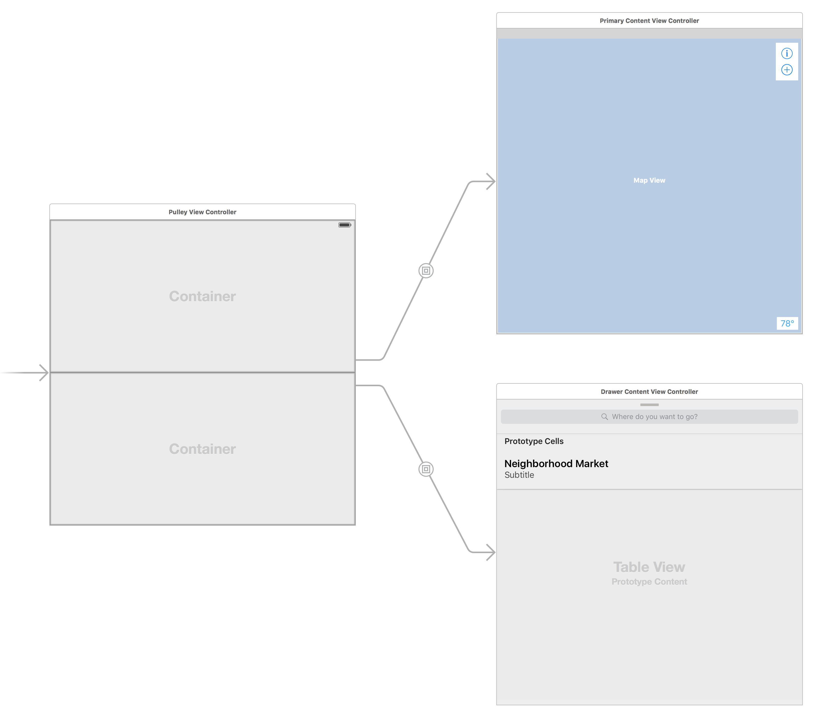 PulleyViewControllerview. One for the drawer content and one for the primary (background) content. - Connect the container view for the primary (background) content to the outlet named primaryContentContainerView.