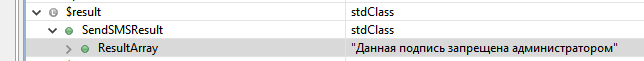 $message = preg_replace('/%error%/i', $result->SendSMSResult->ResultArray[0], $this->errorMessage); неверно работает, когда ResultArray === 'Данная подпись запрещена администратором', а не массив. На скрине дебаггер: