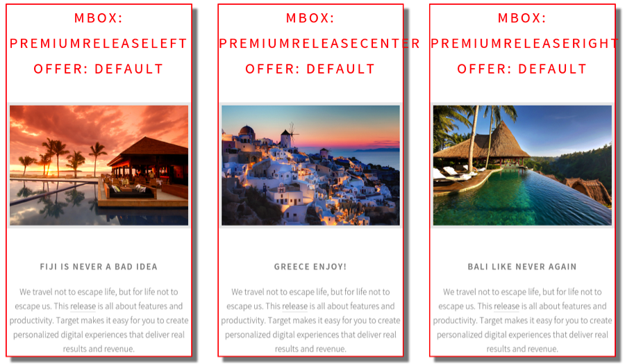 On the site you will see three mbox locations as shown in the image below, which will be delivering targeted content to: