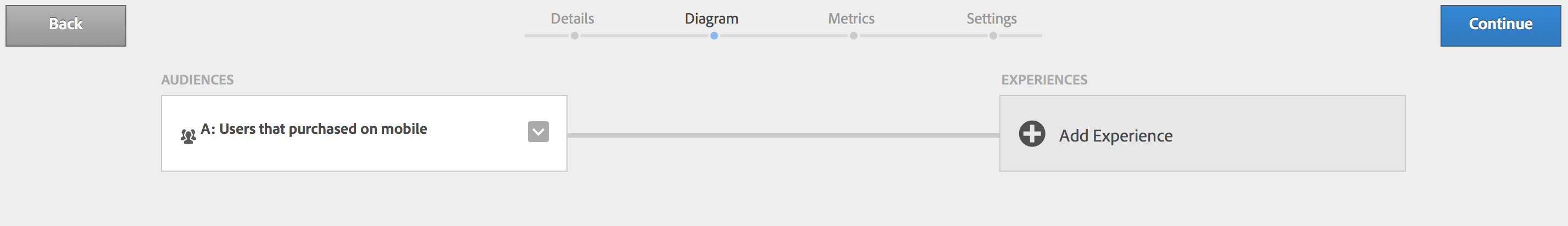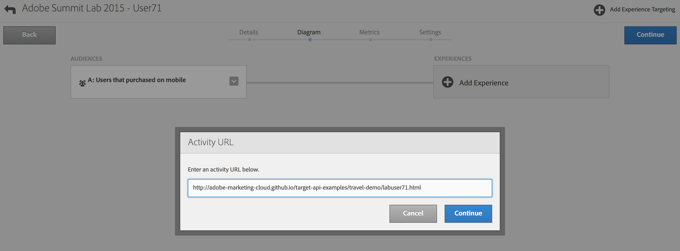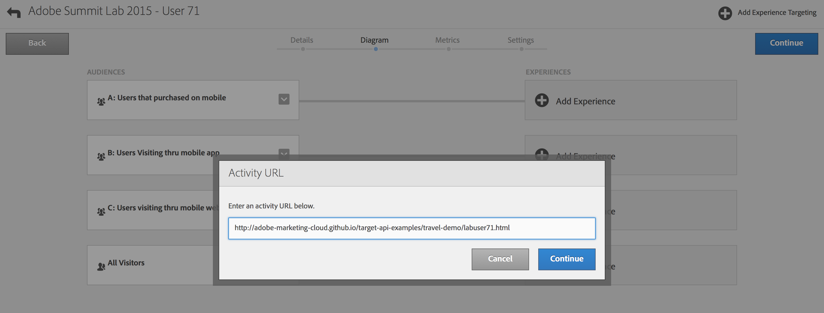 - Step 5: Click add experience for the Audience "A: Users that purchased on mobile". Enter the URL to your travel website in the activity URL
