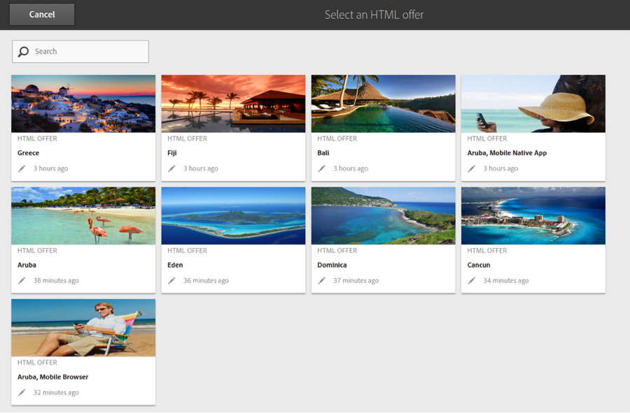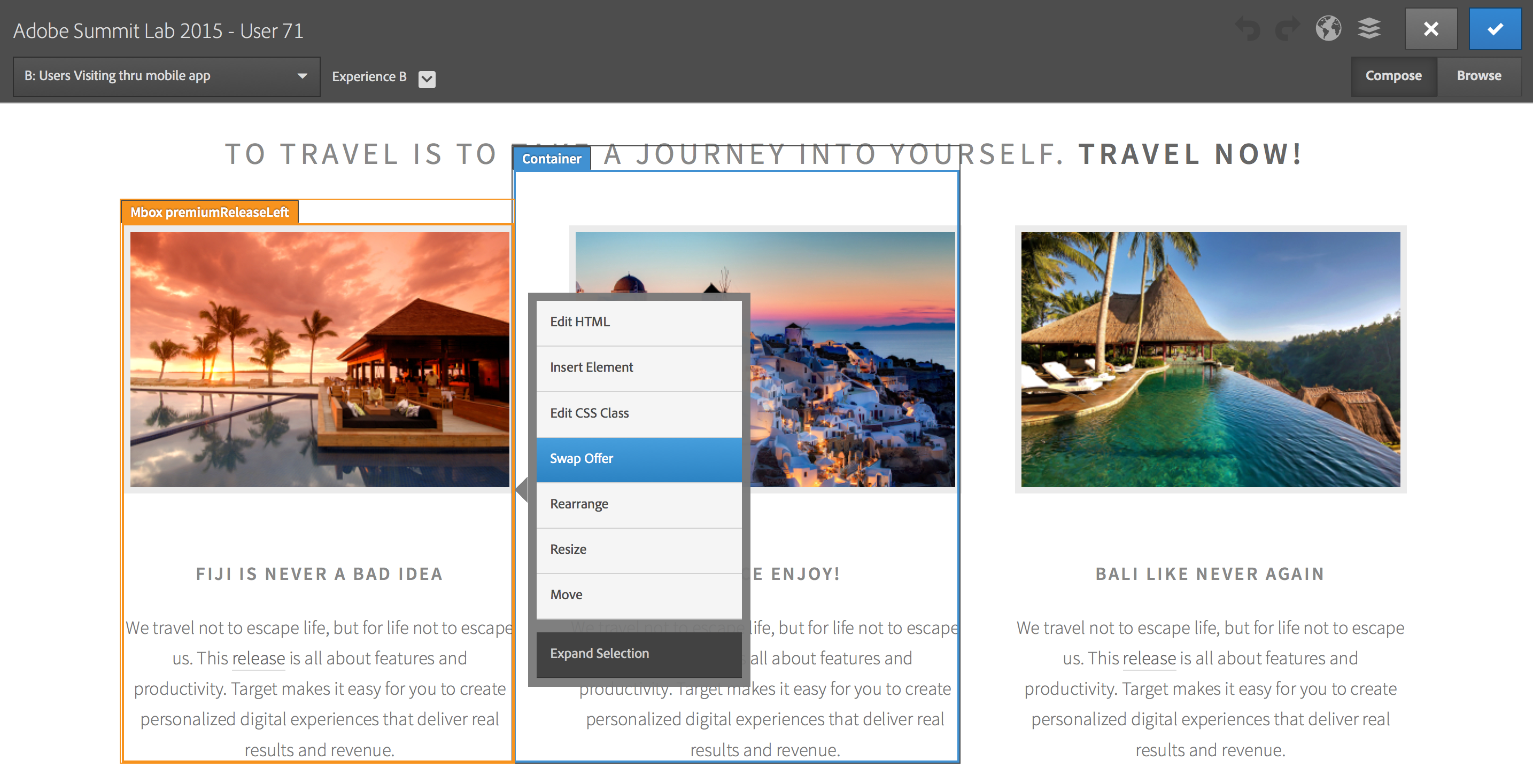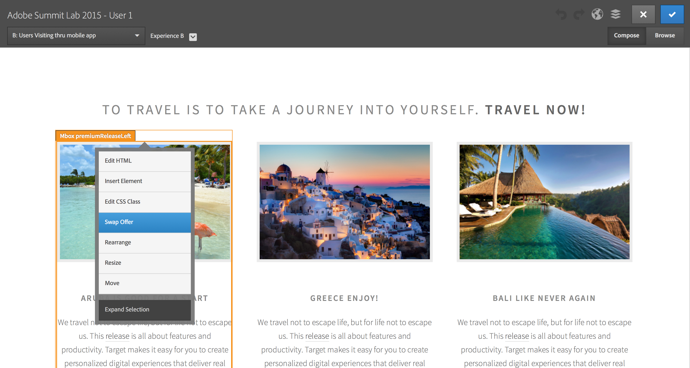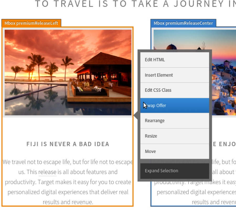 - Step 7: Create the experience in the Visual experience composer. Select premiumReleaseLeft mbox and swap offer to Cancun offer from Release offers content folder. The release offers folder has already been populated with several offers.