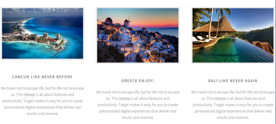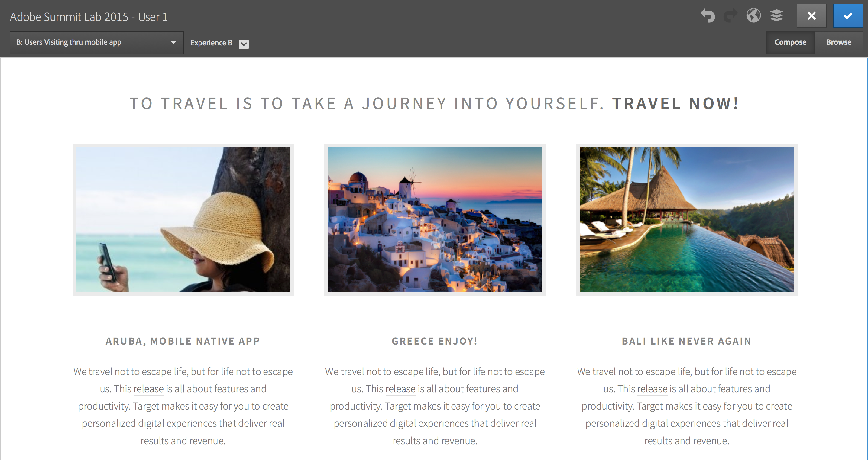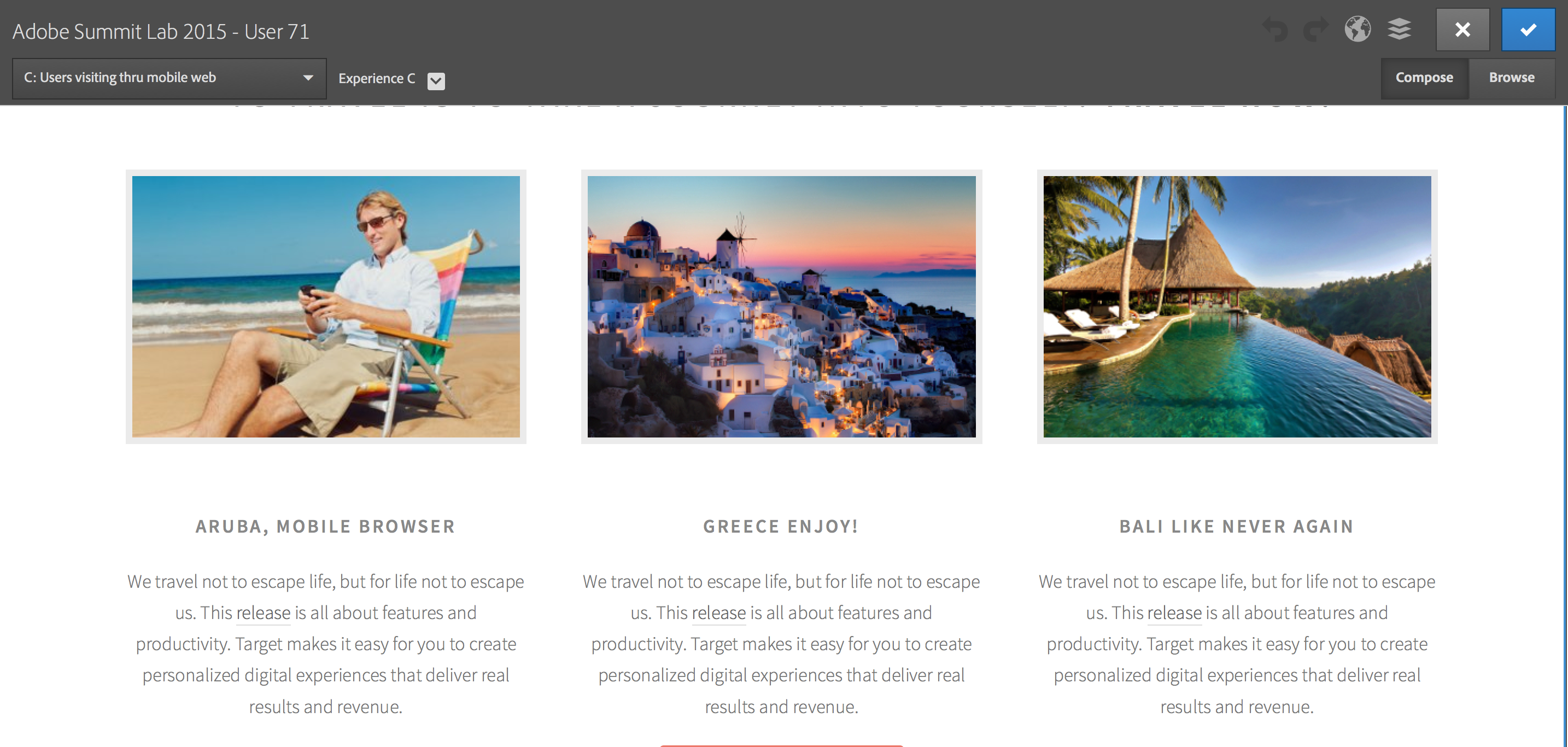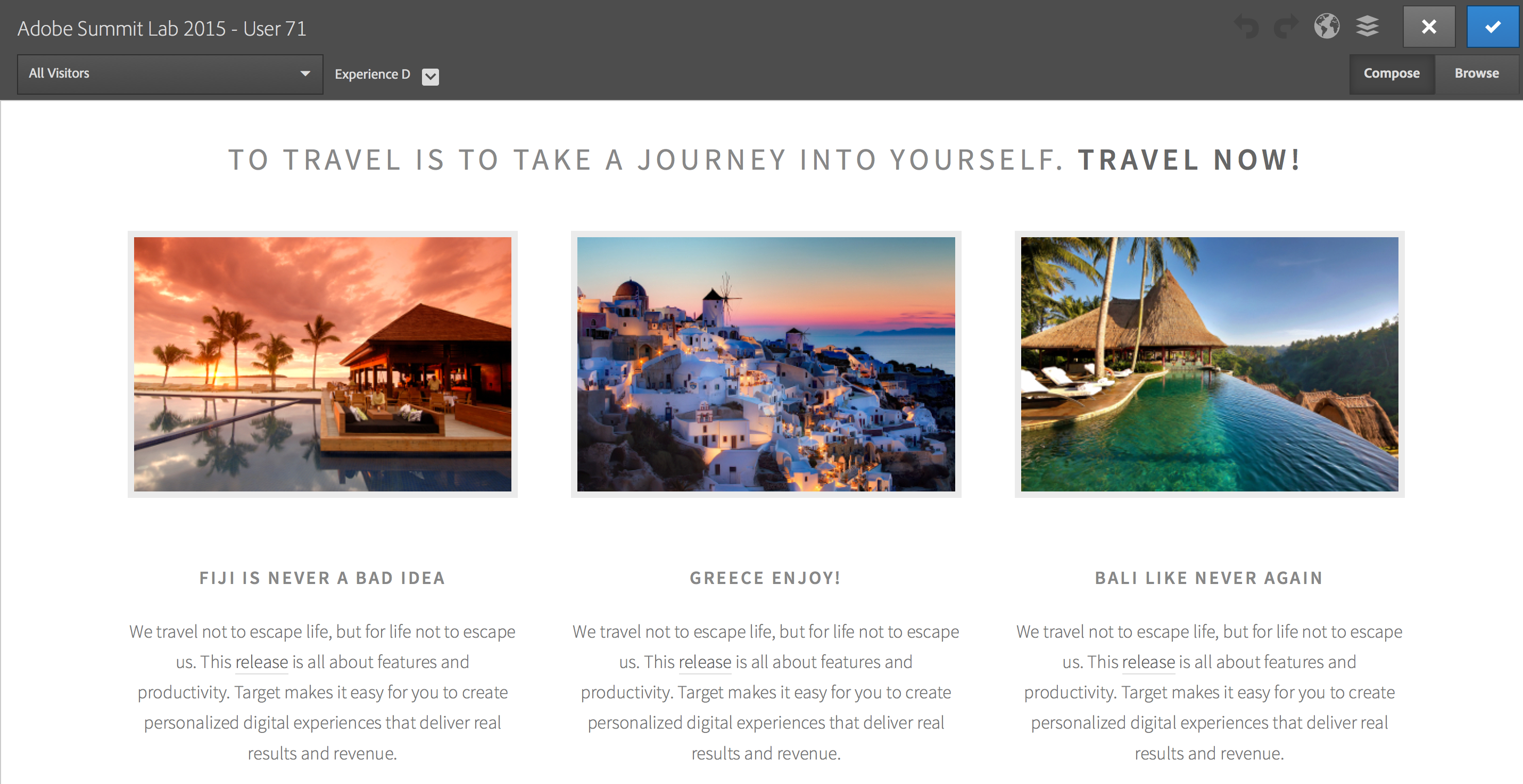 - Step 14: Fire up the browser and go to your travel website. You should see the experience D corresponding to the “All Visitors” audience showing the "Fiji" offer which is the default experience.