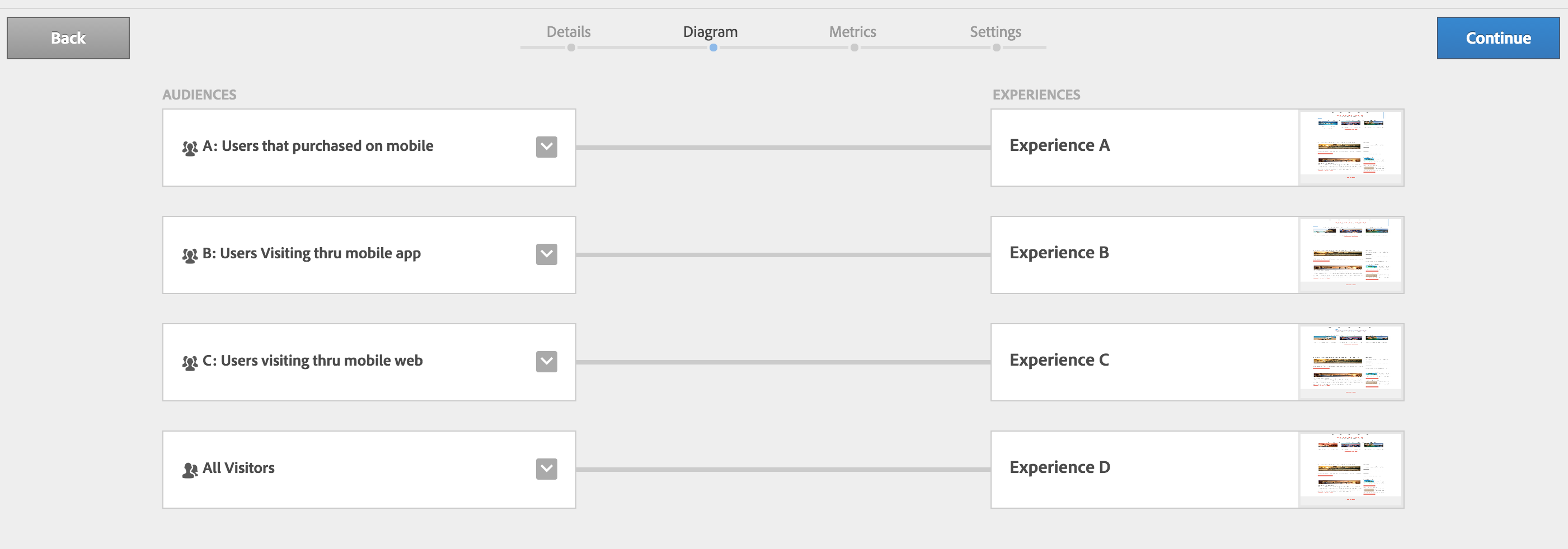 Our goal is to setup an activity which will be used across several devices. To do this we will use predefined audience definitions targeting specific devices and create experiences for them.