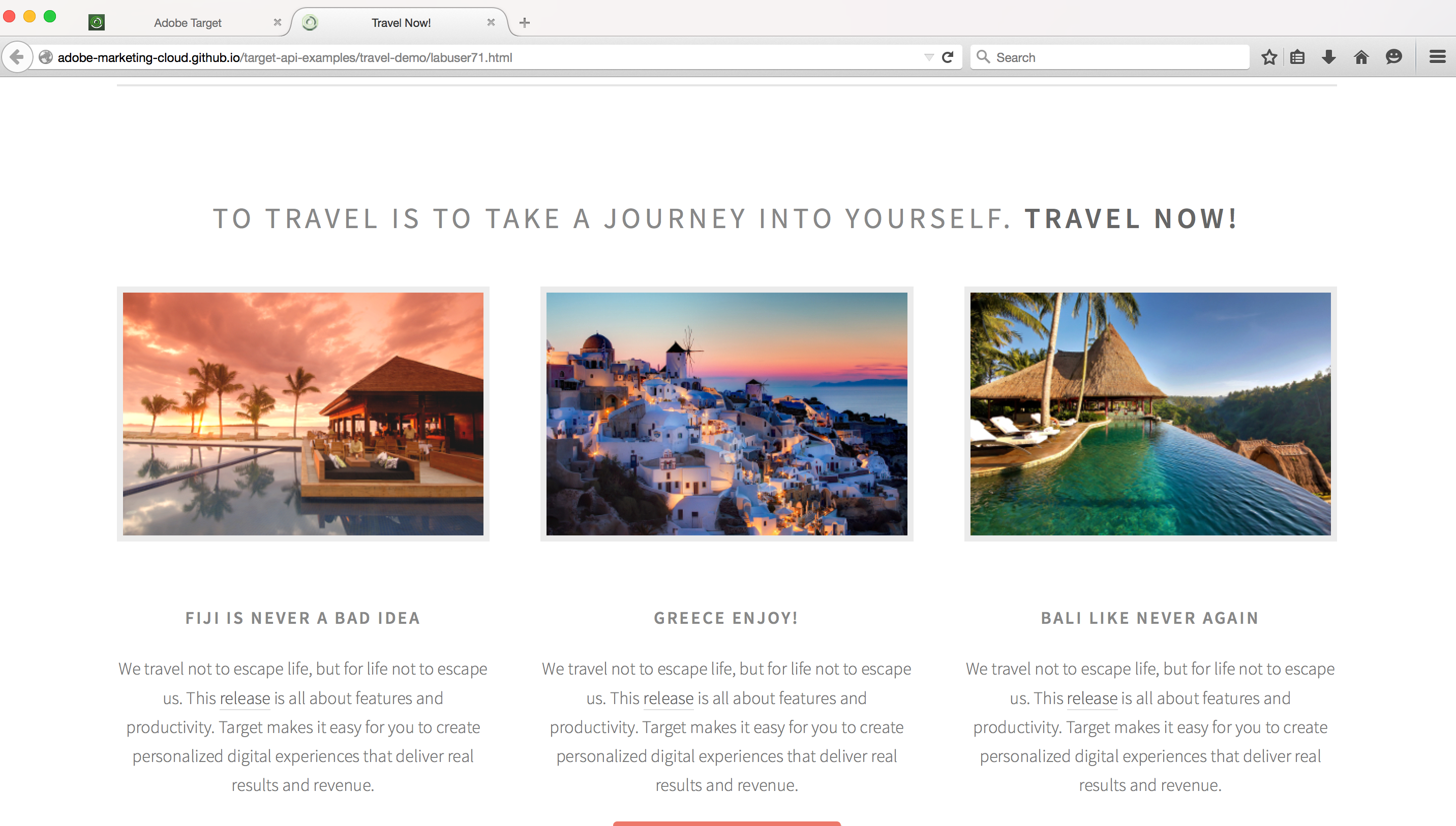 for example : http://adobe-marketing-cloud.github.io/target-api-examples/travel-demo/labuser71.html