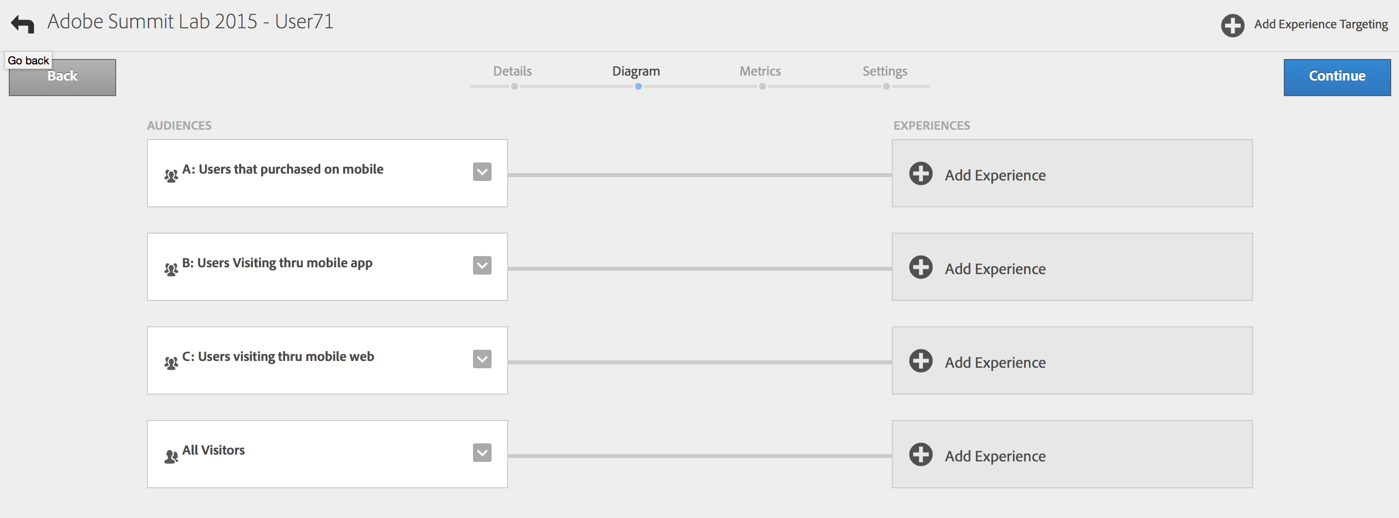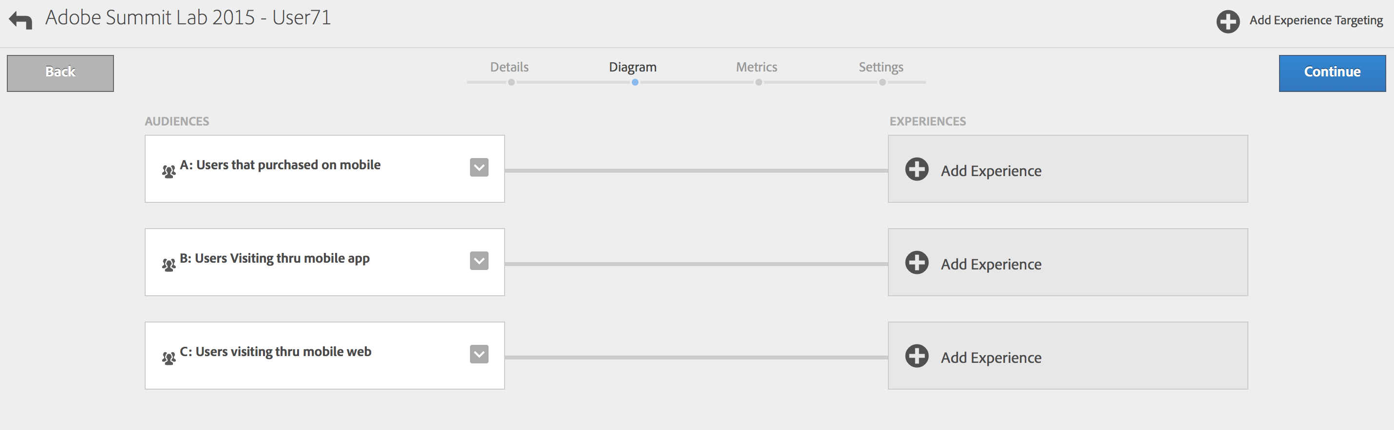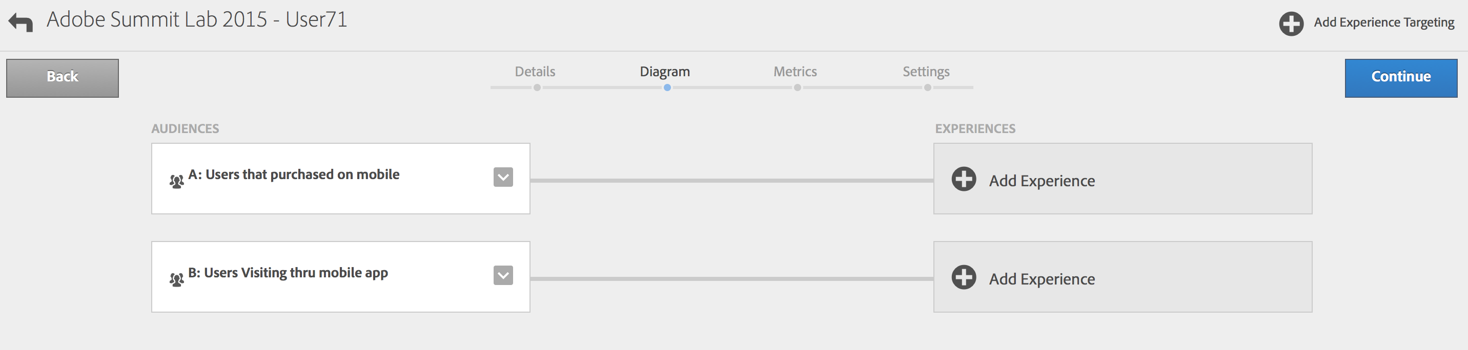 - Step 4b: Click "Add Experience Targeting" button, and then "Add Audiences". Choose the next audience - Audience "B: Users Visiting thru mobile app".