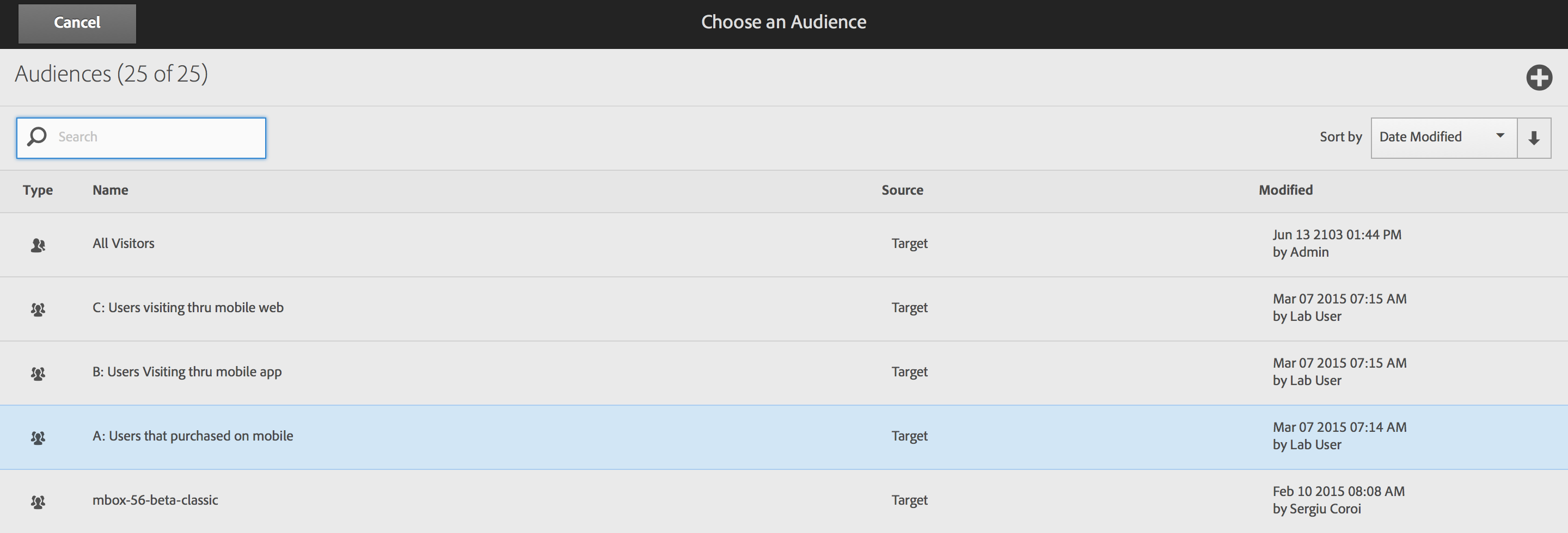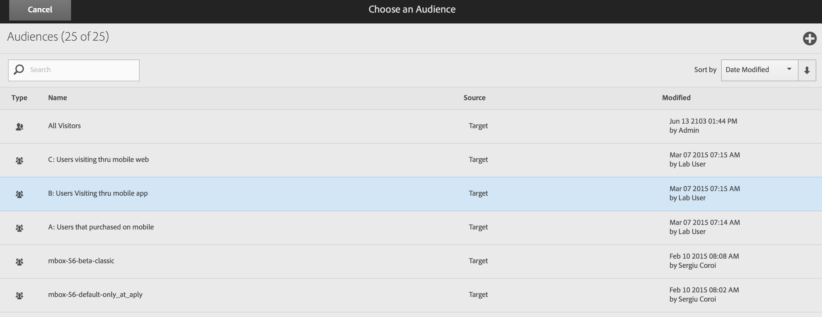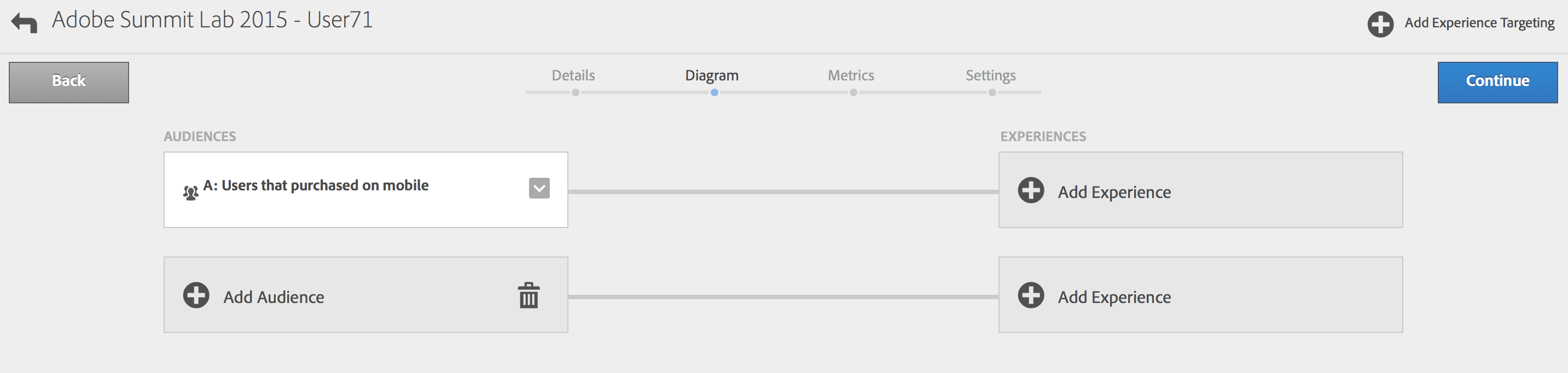 - Step 4b: Click "Add Experience Targeting" button, and then "Add Audiences". Choose the next audience - Audience "B: Users Visiting thru mobile app".