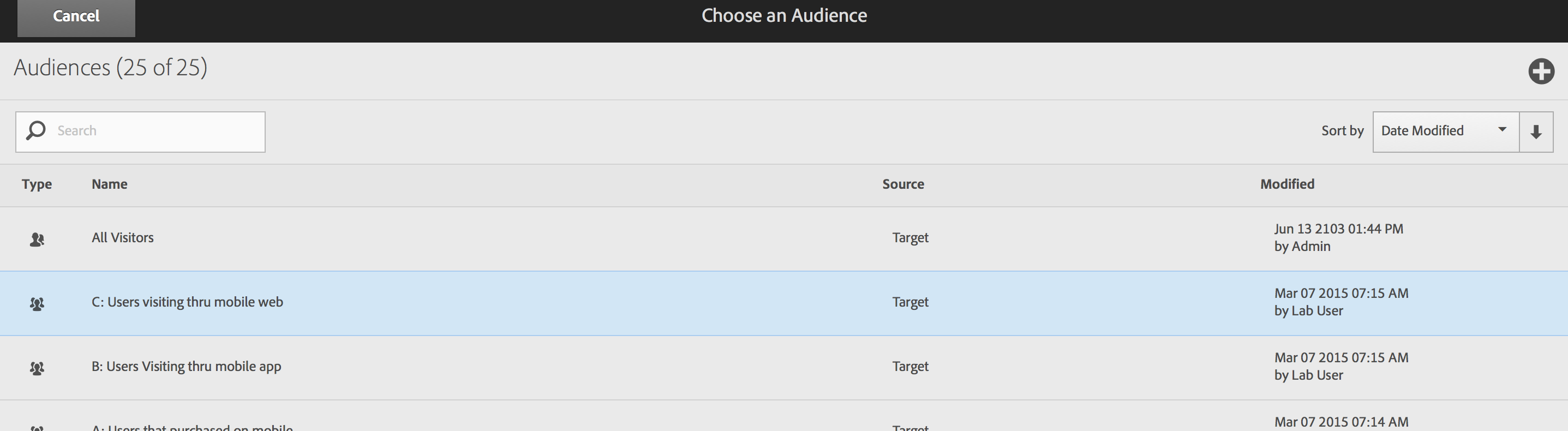 - Step 4c: Click "Add Experience Targeting" button, and then "Add Audiences". Choose the next audience - Audience "C: Users Visiting thru mobile web".