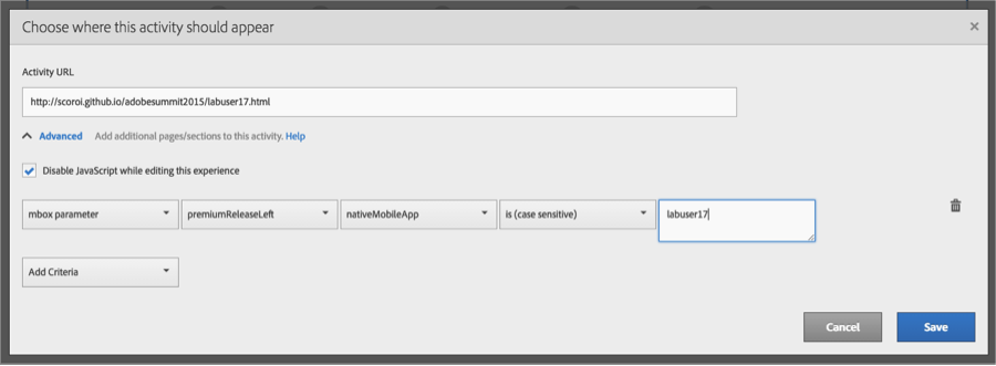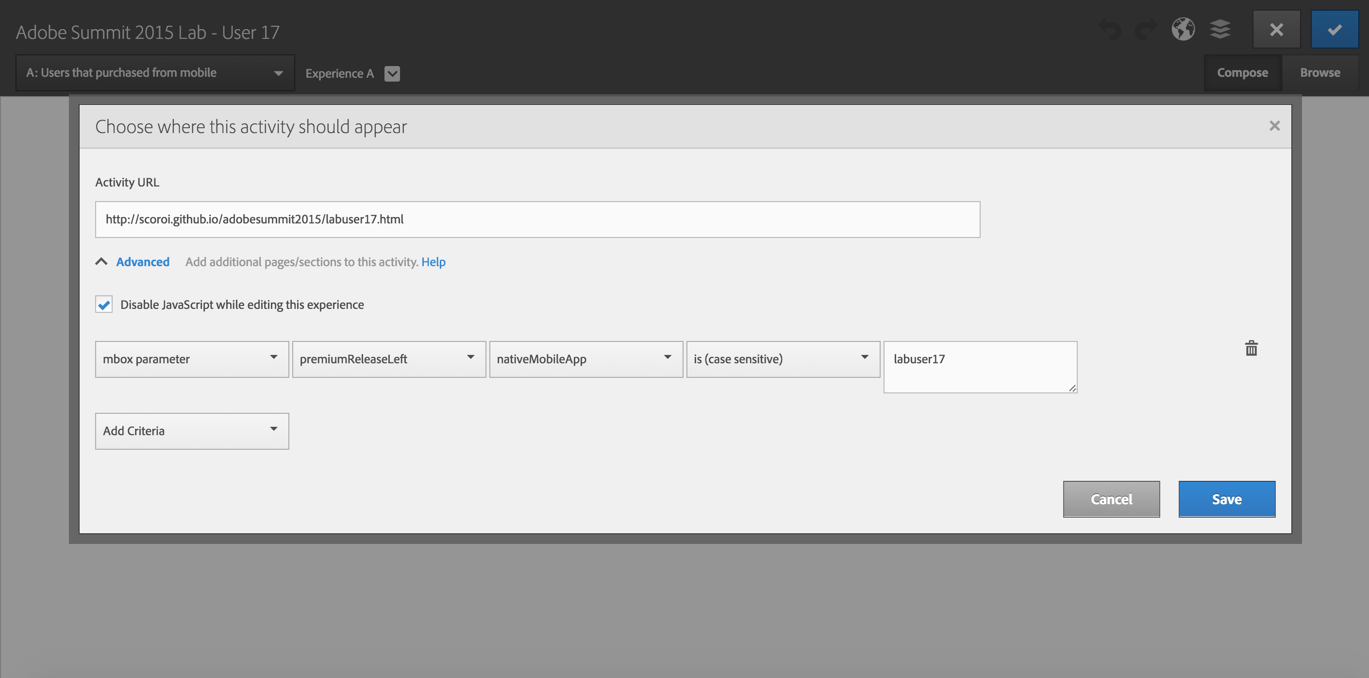 - Step 6b) Add mobile mbox parameter to URL targeting as shown below. Set the value to your labuser, for instance labuser17.