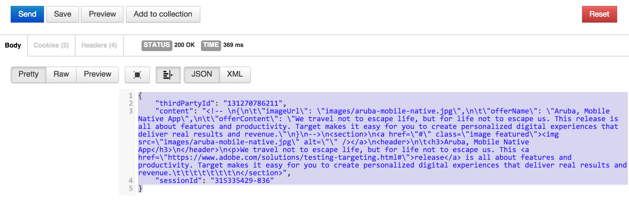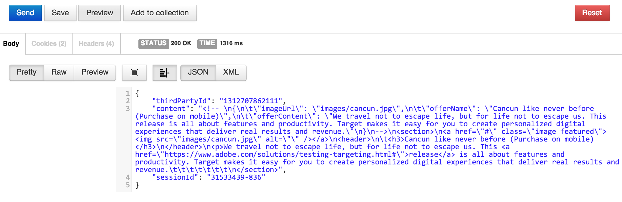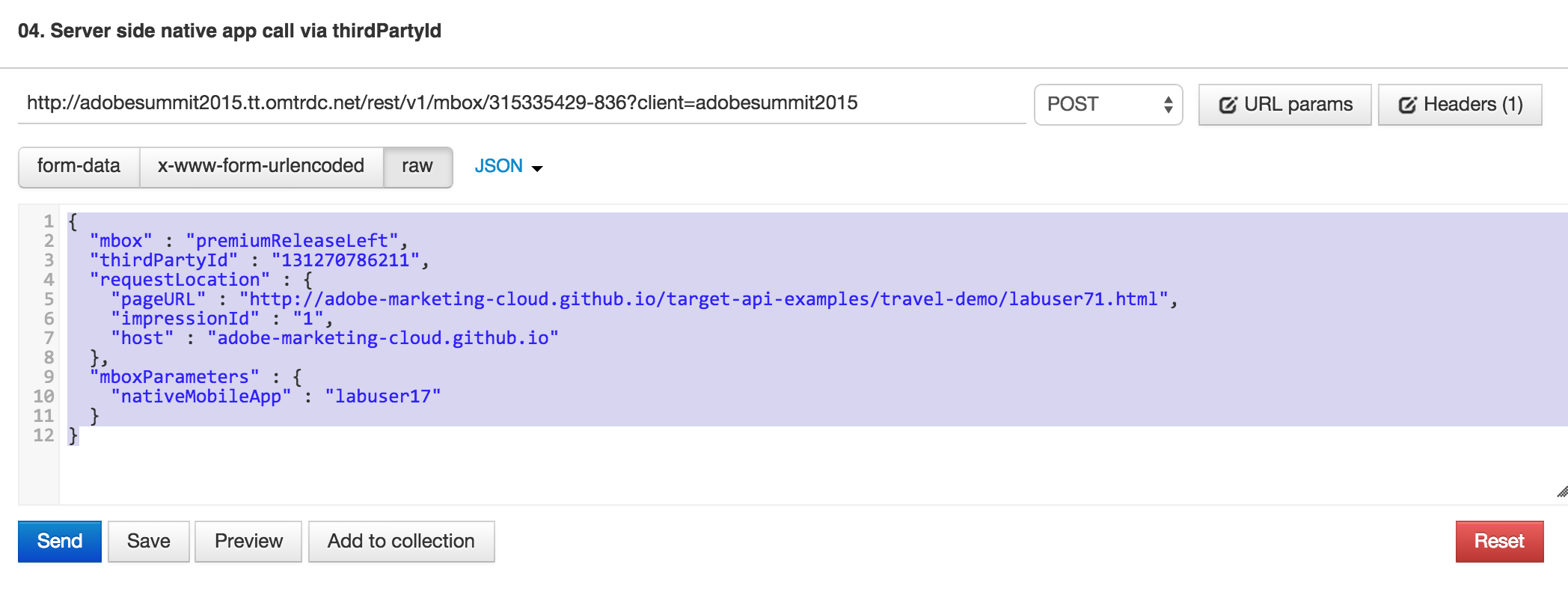 http://adobesummit2015.tt.omtrdc.net/rest/v1/mbox?client=adobesummit2015The request url contains a session id and the client code, the rest of the details are passed in the HTTP POST payload as shown below.