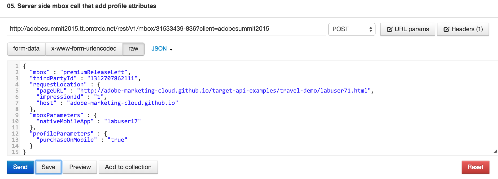 }In Postman locate the call titled 05. Server side mbox call that add profile attributes. Make sure you update the USERNUMBER and thirdPartyId in the request payload and click "Send"