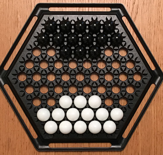 Abalone is a two-players strategy board-game on a hexagonal grid. Each player starts with 14 marbles, and take turns in making moves consisting of a line of 1,2, or 3 marbles in any of the 6 directions. A player can push opponent's marbles only if the move was in-line (same direction as the line of marbles), the number of player's marbles is greater than the opponent's marbles, and the opponent's marbles are pushed into an empty location or outside the grid. The first player to push 6 of their opponent's marbles outside the grid is considered the winner.