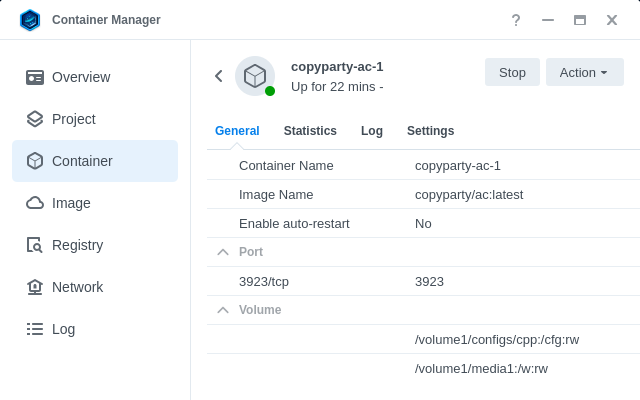 to update to a new copyparty version: Container Manager » Images » Update available » Update