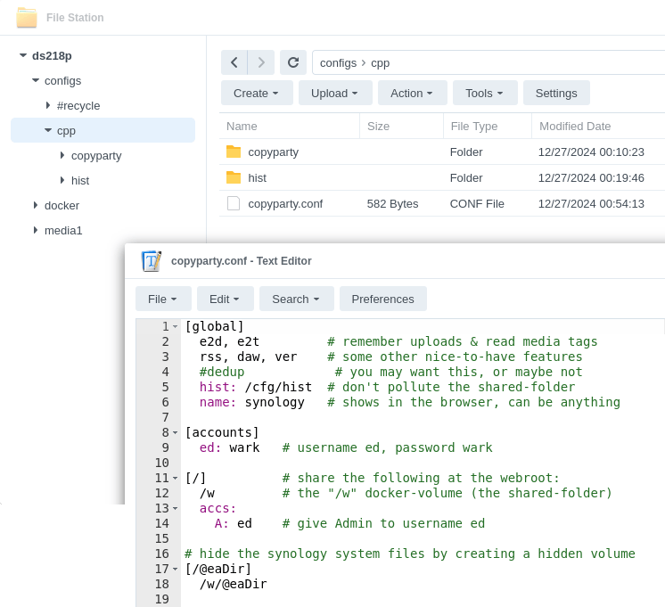 A: ed # give Admin to username edif you ever change the copyparty config file, then restart the container to make the changes take effect