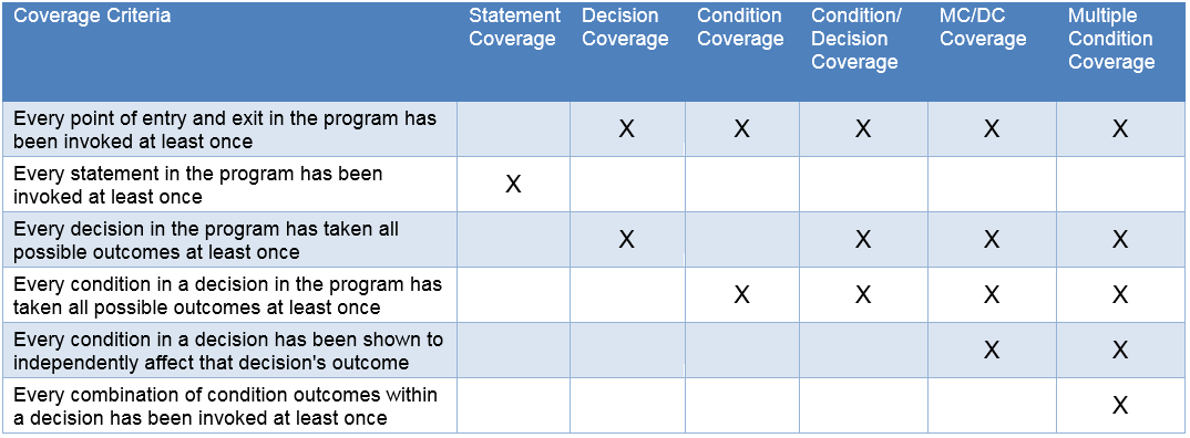 As mentioned above, the completeness of tests can be shown by structural coverage methods. There are many different procedures available. And the more complex operations subsume the easier ones. Here a brief overview.