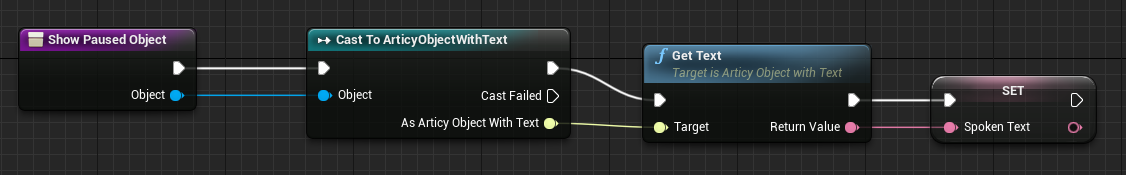 Once you have assigned your ArticyRef variable, you can then get access to the object by calling the 'Get Object' function. The returned object is an ArticyObject that requires casting or alternatively, the 'Get Object' function will cast it for you to the specified class.
