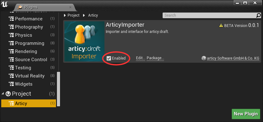 Now you can open your Unreal project and open the Plugins window by selecting Edit->Plugins in the main window menu bar. Inside this window scroll in the list of groups down until you find the Group Project (in case you are using the plugin on a project basis), or under Installed (in case you are using it as an engine plugin) and the sub group Articy, click on Articy and enable the ArticyXImporter on the right.