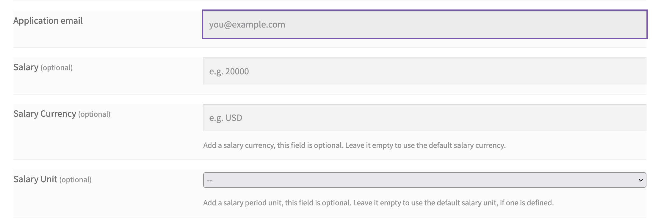 Add a salary currency, this field is optional. Leave it empty to use the default salary currency.