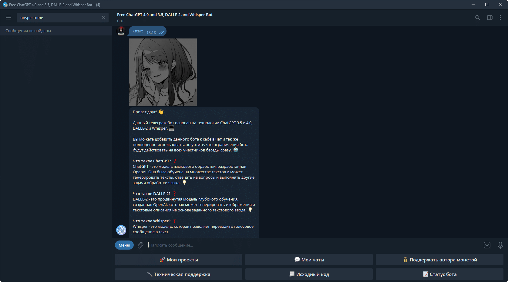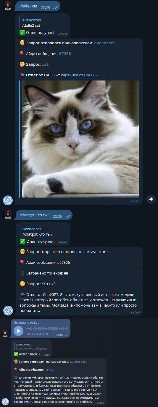 start: Документация по использованиюchatgpt3: Генератор текста с использованием модели GPT 3.5dalle2: Генератор картинокlog: Выгрузить логи бота с сервераaddadmin: Добавить аккаунт в чисто Администраторов по UserIDremoveadmin: Удалить аккаунт из числа Администраторов по UserIDban: Забанить аккаунт по UserIDunban: Разбанить аккаунт по UserIDid: Информация о васadminlist: Список Администраторовreboot: Перезапустить бота