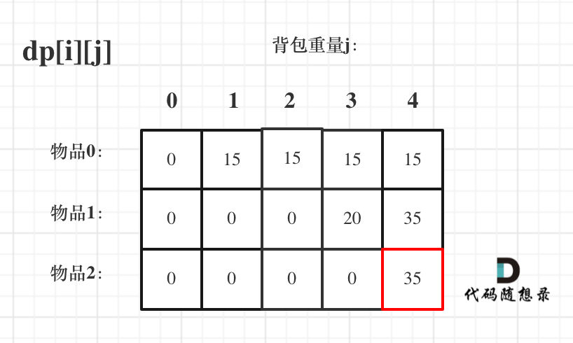 再回顾一下dp[i][j]的含义:从下标为[0-i]的物品里任意取,放进容量为j的背包,价值总和最大是多少。