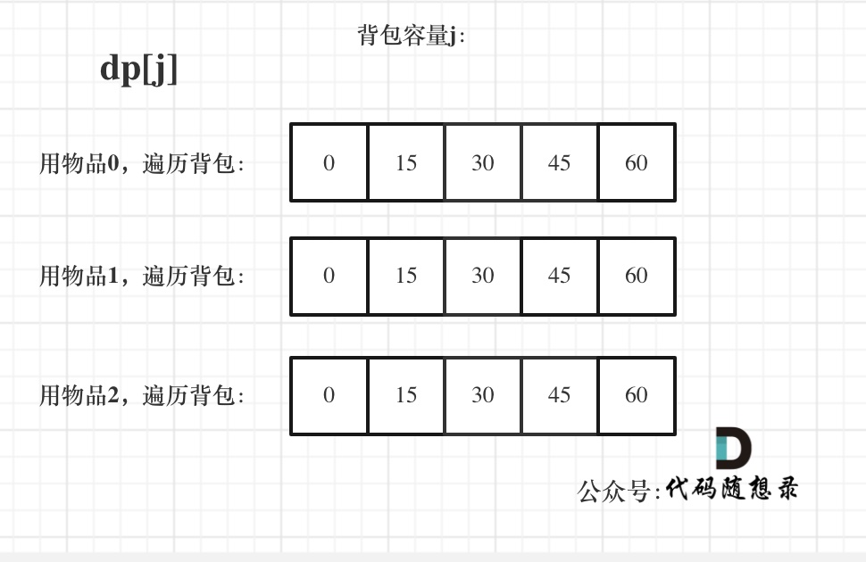 遍历背包容量在外层循环,遍历物品在内层循环,状态如图: