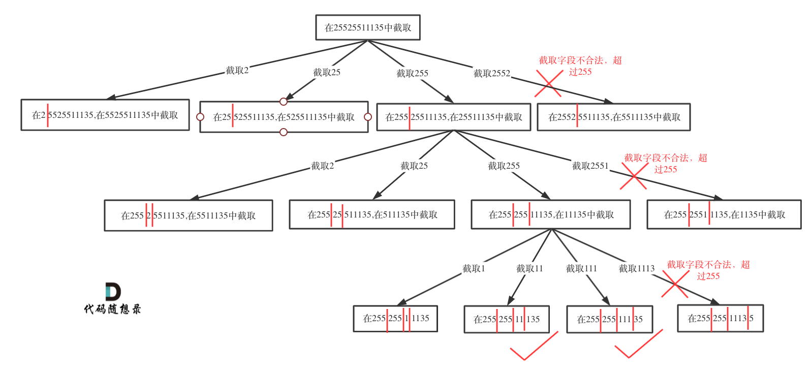 终止条件和回溯算法:分割回文串情况就不同了,本题明确要求只会分成4段,所以不能用切割线切到最后作为终止条件,而是分割的段数作为终止条件。