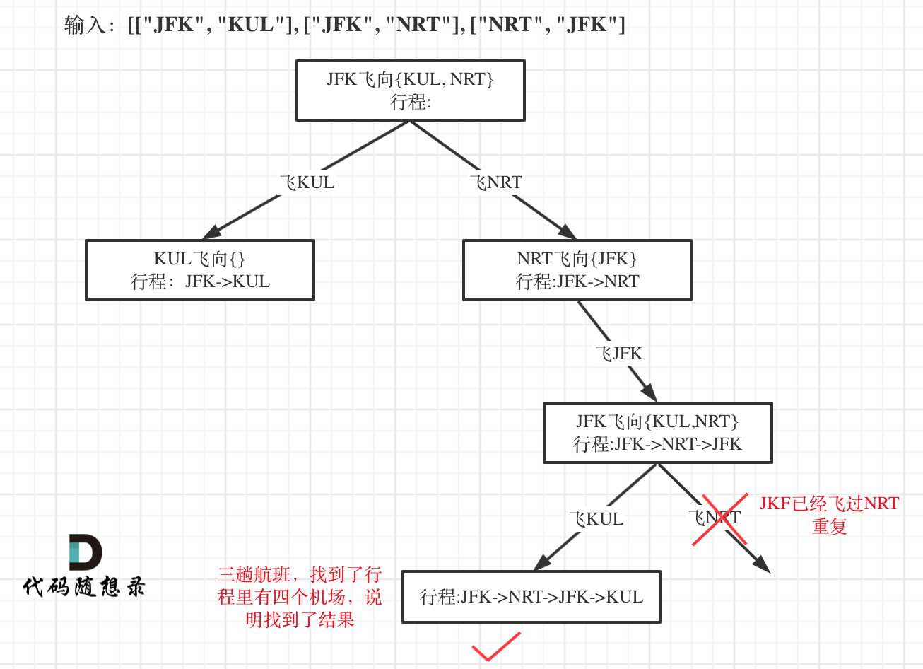 为什么要举这个例子呢,就是告诉大家,出发机场和到达机场也会重复的,如果在解题的过程中没有对集合元素处理好,就会死循环。