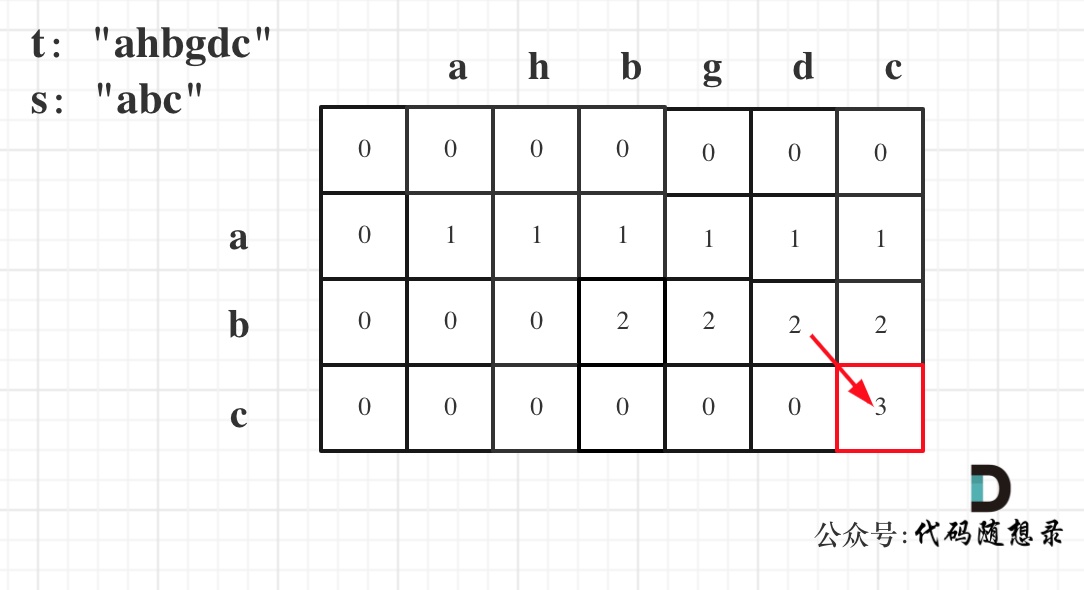 图中dp[s.size()][t.size()] = 3, 而s.size() 也为3。所以s是t 的子序列,返回true。