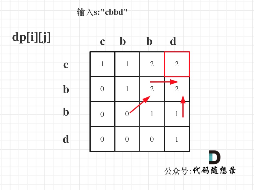 递推公式:dp[i][j] = dp[i + 1][j - 1] + 2,dp[i][j] = max(dp[i + 1][j], dp[i][j - 1]) 分别对应着下图中的红色箭头方向,如图: