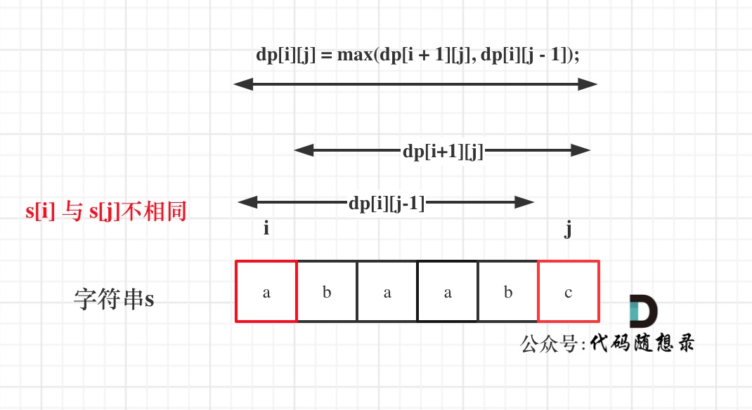 如果s[i]与s[j]不相同,说明s[i]和s[j]的同时加入 并不能增加[i,j]区间回文子串的长度,那么分别加入s[i]、s[j]看看哪一个可以组成最长的回文子序列。