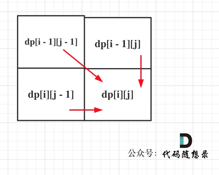 从递推公式,可以看出,有三个方向可以推出dp[i][j],如图: