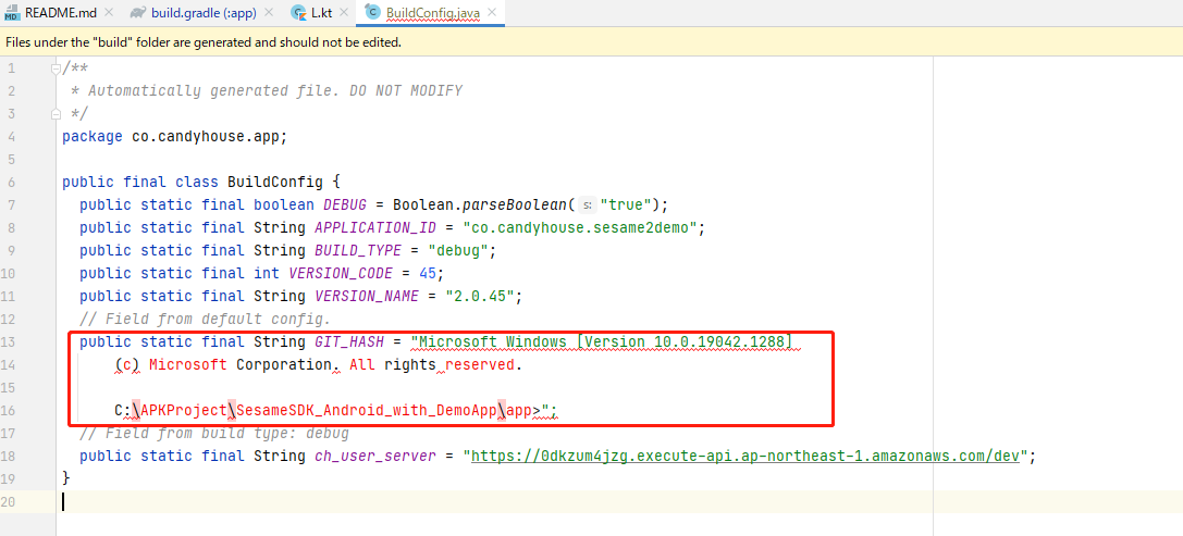 SDKでSesameを制御したいですが、Android Studioで実行して、以下のようなエラーが出てしまいました。 ファイルの上で「Automatically generated file. DO NOT MODIFY」と書いてありますが、どう修正すればいいでしょうか。
