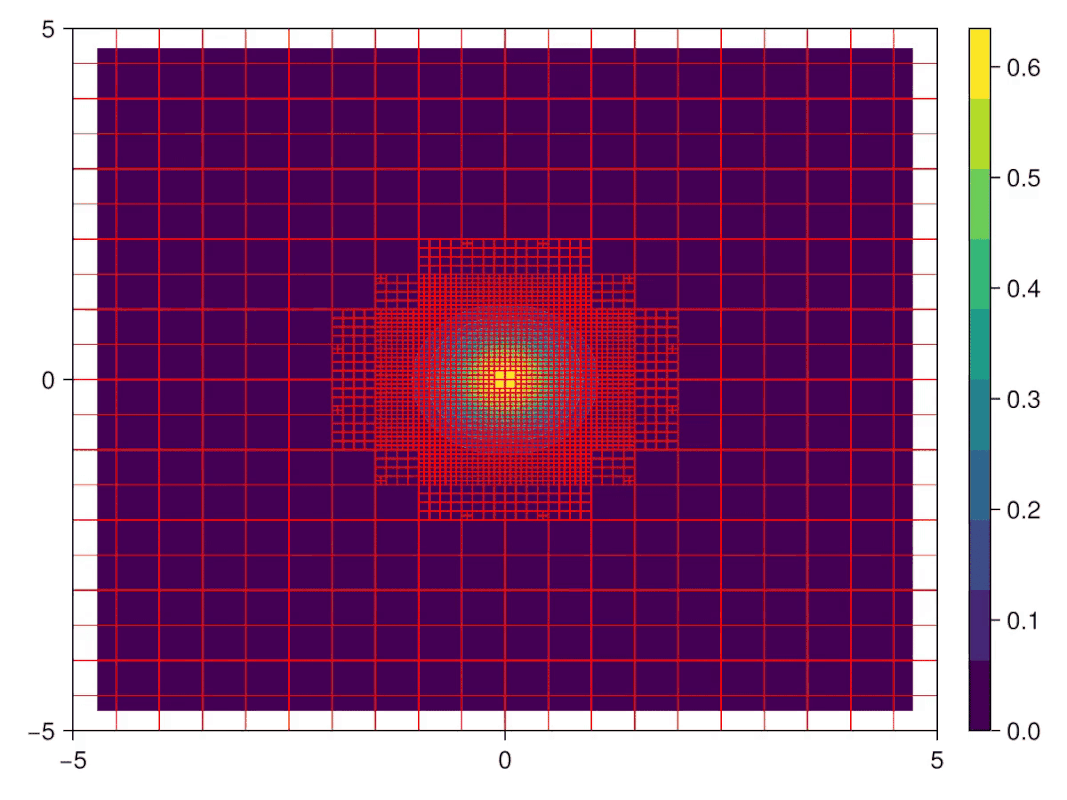 The current solver discretizes with tree-based Cartesian grids, adapting the mesh in both physical and velocity space simultaneously, according to characteristics including velocity field gradients, boundary complexity, and energy proportion at phase points. Users can also customize the criteria for grid refinement or coarsening according to their own needs.