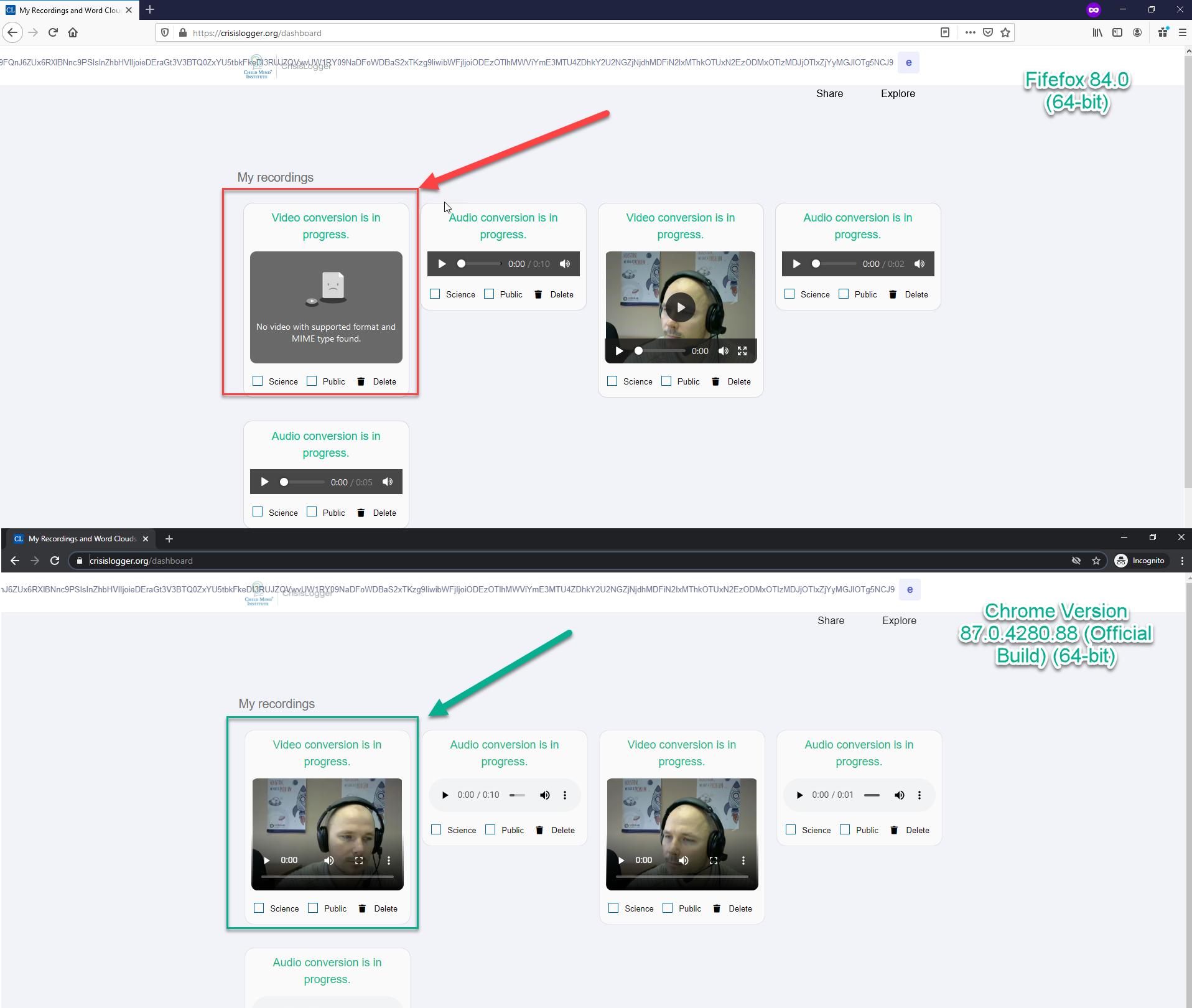 Actual result: The video recording taken by Chrome browser is displayed as broken on the Firefox browser