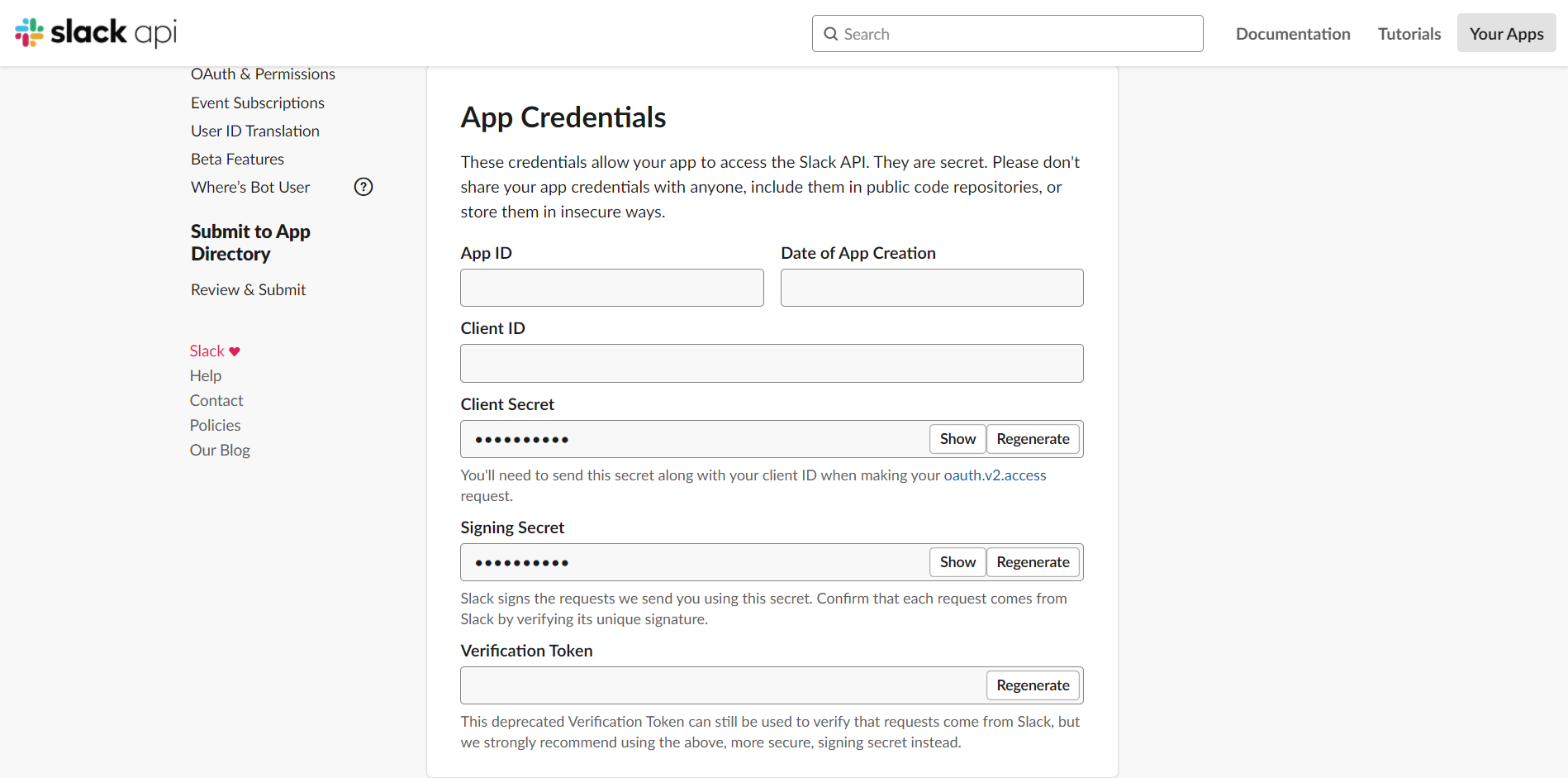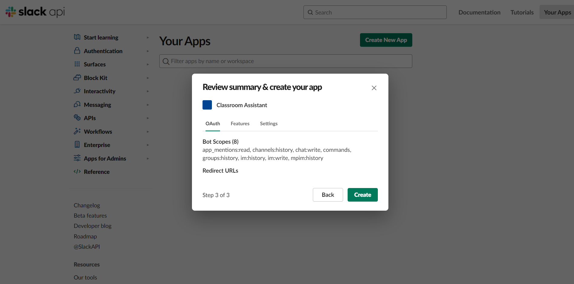 Enter the necessary URLs for the ../slack/events and ../slack/oauth_redirect endpoints.