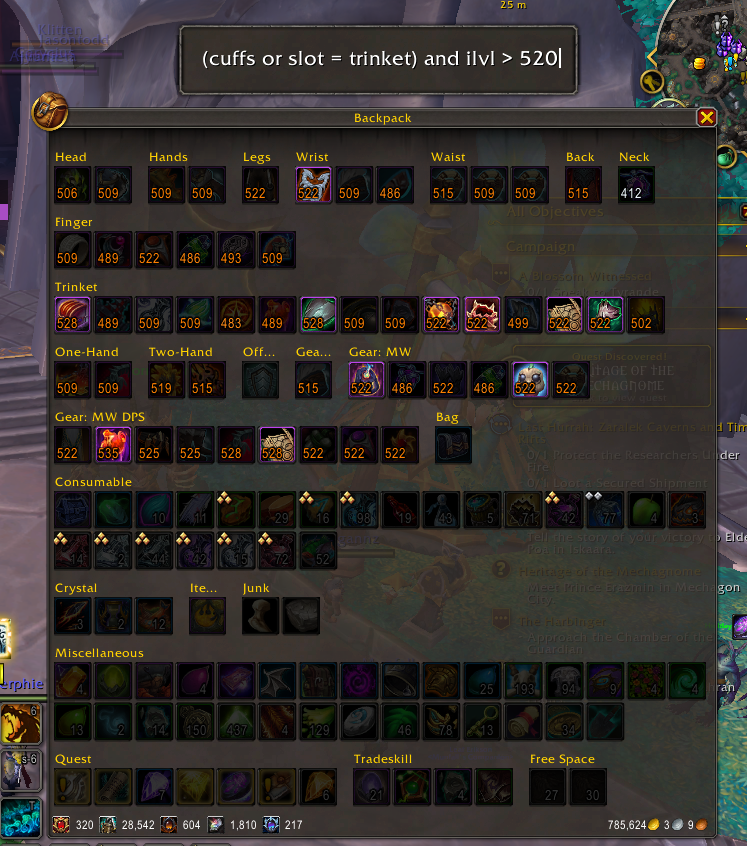 levelorilvl(ilvl = 528) The item level of the item. Non-gear items have item levels as well, but they are not shown to the user.rarity(rarity = epic or rarity = 4) The rarity of the item. Poor = 0, Common = 1, Uncommon = 2, Rare = 3, Epic = 4, Legendary = 5, Artifact = 6, Heirloom = 7.id(id = 212685) The internal itemID of the item. A number uniquely identifying the base item. Specific ItemIDs can be found in the url on the item's WoWHead page.stackCountorcount(stackCount = 1) The number of items in the stack for the item. NOTE: Currently count only takes into account the stack size of the "base" stack when using virtual stacks. For example, a virtual stack of 20, 20, and 3 to total 43 items will only be matched with either 20 or 3, not both.class(class = 4) The numeric representation of itemType.subclass(subclass = 0) The numeric representation of itemSubtype. See the Warcraft Wiki for more information regarding class and subclass.bagid(bagid = 2) The location of the bag containing the item. BagID is 0 for the main backpack, 1-4 for the bags, 5 for a reagent bag (Retail only), -1 for the main bank window, 6-12 for bank bags, -3 for the reagent bank, -2 for the keyring (Classic only), and 13-17 for warbank tabs.slotid(slotid = 11) The slot that the item is in, in the bag that contains it. Numbered from 1 to N for each bagID, where N is the size of the container.bindtype(bindtype = 1) The binding type of the item returned by GetItemInfo(). 1 = BoP, 2 = BoE, 3 = BoU, 4 = Quest, 7 = BtA, 8 = BtW, 9 = WuE. See the Warcraft Wiki for specifics.