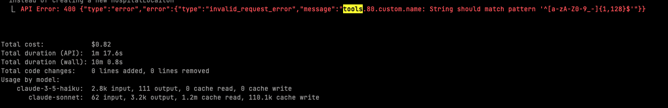 API Error: 400 {"type":"error","error":{"type":"invalid_request_error","message":"tools.80.custom.name: String should match pattern '^[a-zA-Z0-9_-]{1,128}$'"}}