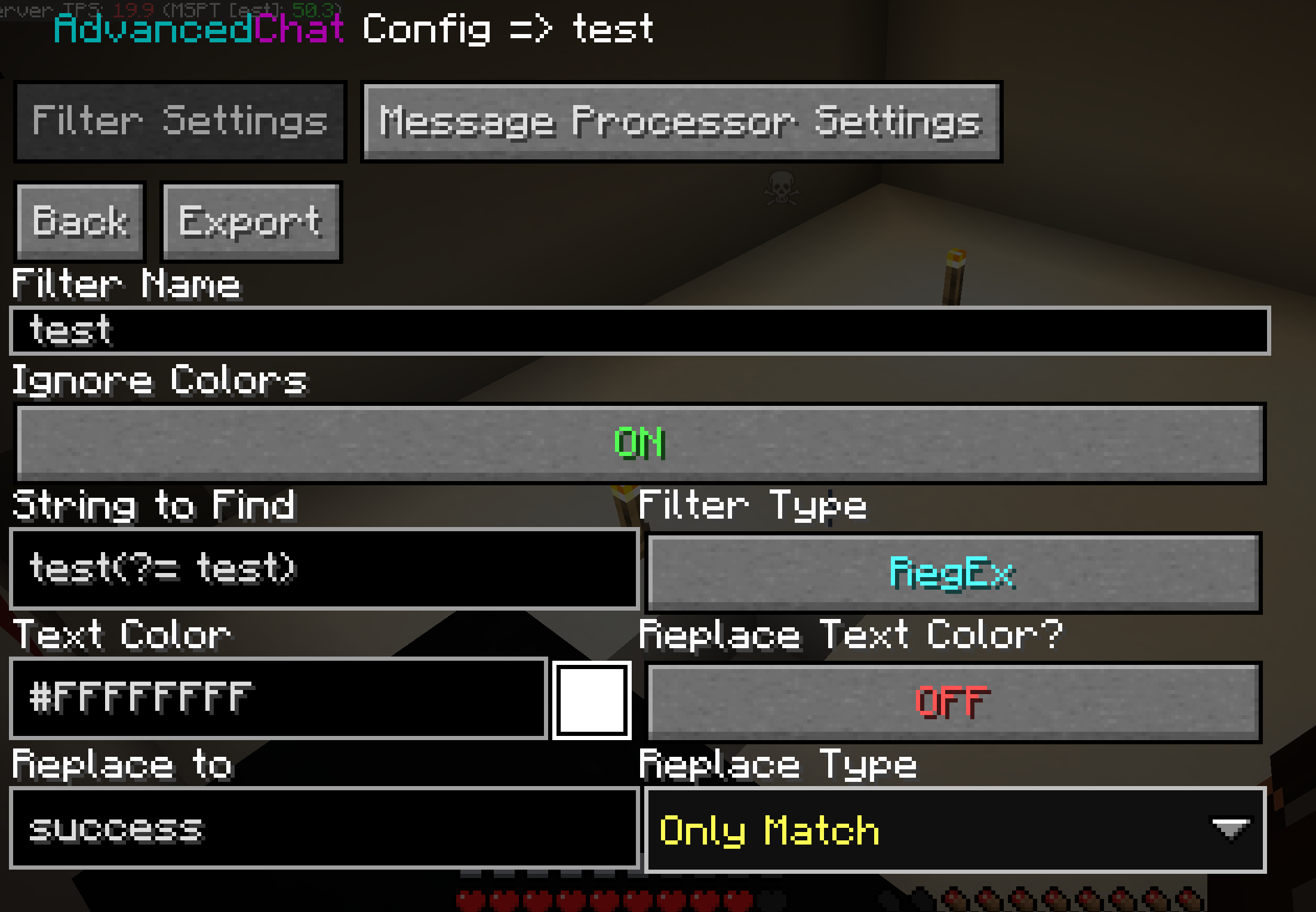 {"name":"foot","active":true,"stripColors":true,"findString":"testt(?\u003d test)","findType":"regex","replaceType":"onlymatch","replaceTo":"success","replaceTextColor":false,"textColor":"#FFFFFFFF","replaceBackgroundColor":false,"backgroundColor":"#FFFFFFFF","processors":{"forward":{"active":true},"actionbar":{"active":false},"sound":{"active":false,"notifySound":"none","soundPitch":1.0,"soundVolume":1.0},"narrator":{"active":false,"message":"$1"}},"order":0}