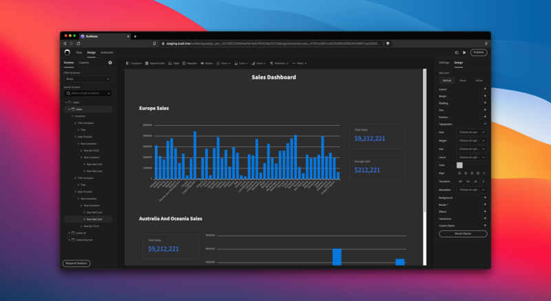 Design and build apps with powerful pre-made components. Budibase comes out of the box with beautifully designed, powerful components which you can use like building blocks to build your UI. We also expose a lot of your favourite CSS styling options so you can go that extra creative mile. Request new component.