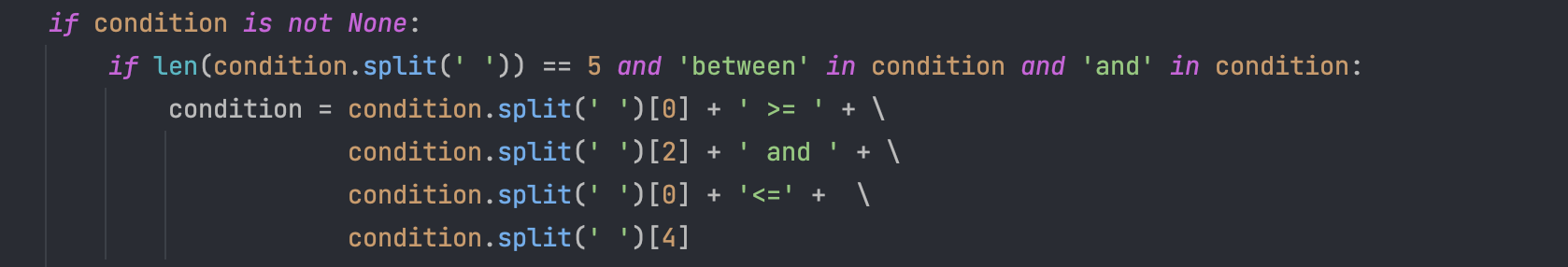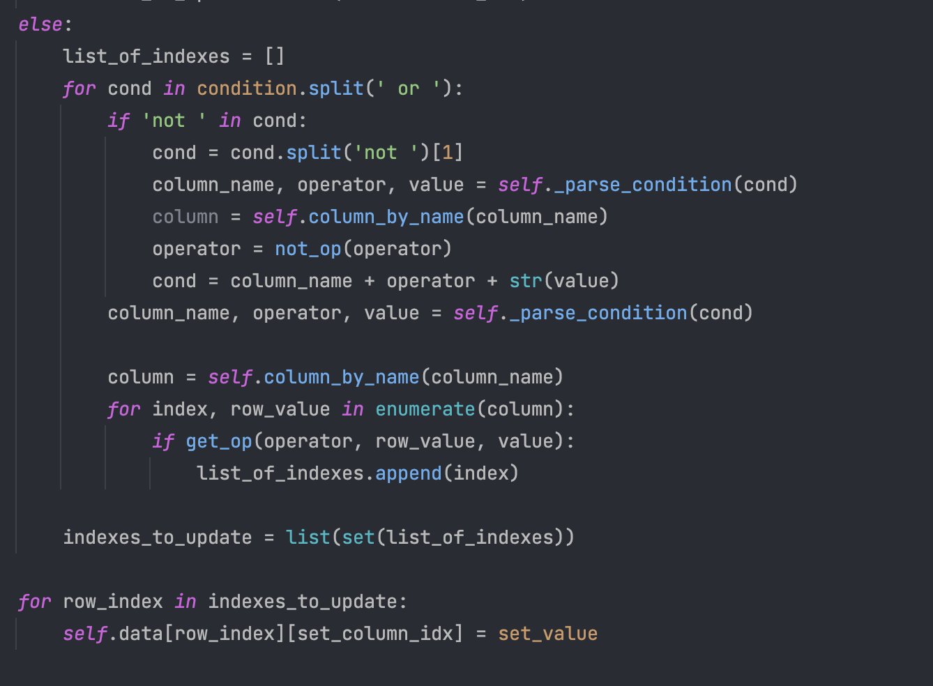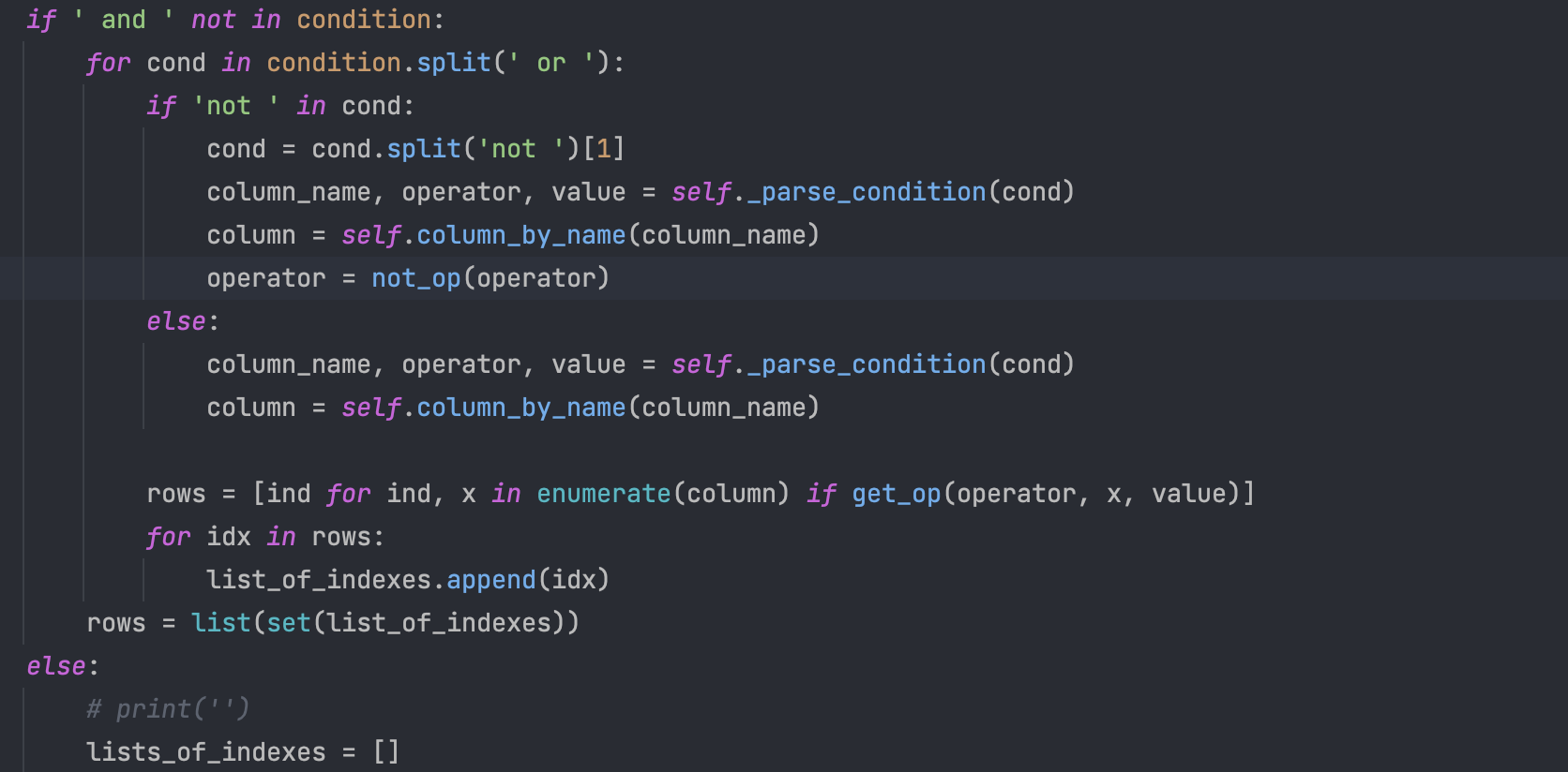 Σε αυτό το κομμάτι κώδικα, αφού έχουμε σπάσει τις συνθήκες στα and και τα or ελέγχουμε έαν η κάθε επιμμέρους συνθήκη περιέχει κάποιο not, σε περίπτωση που έχει, αντιστρέφουμε τον operator με την not_op, ξανασυντάσουμε την συνθήκη και συνεχίζουμε την διαδικασία.b) Για την υλοποίηση του AND και του OR παρατηρήσαμε την λειτουργεία της table.py για την εκτέλεση του condition και προσθέσαμε τα κατάλληλα κομμάτια κώδικα. Πιο συγκεκριμένα: