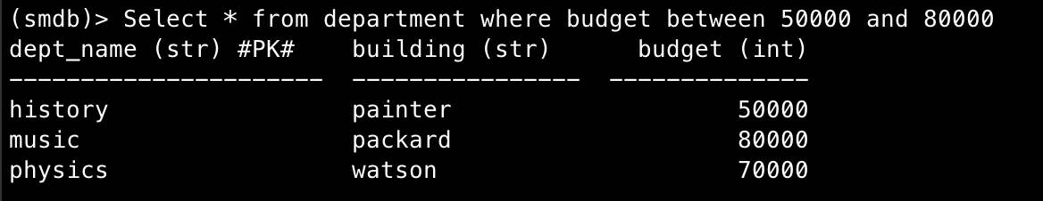 a) Για την υλοποίηση του between παρατηρήσαμε οτι αρκεί να parsarουμε το condition σhτν table.py σε περίπτωση που έχει column_name between value1 and value2 και να το μετατρέψουμε σε column_name >= value1 and column_name <= value2