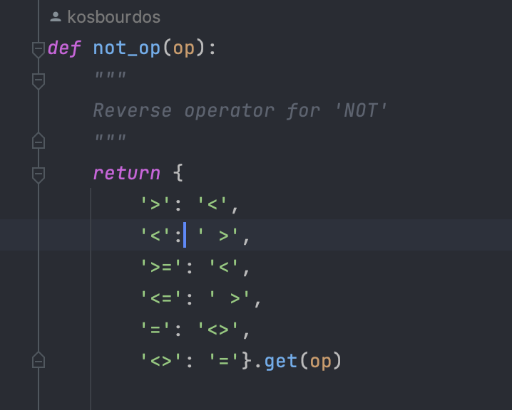 Για την υλοποίηση του NOT αρχικά έπρεπε να προσθέσουμε μία συνάρτηση στο misc.py, η οποία όταν ο quuery parser θα ανιχνεύει το "ΝΟΤ" θα αντριστέφει τον operator της συνθήκης