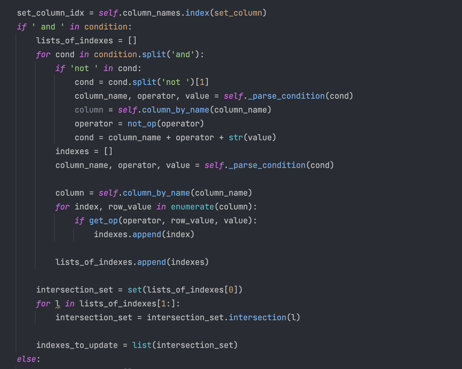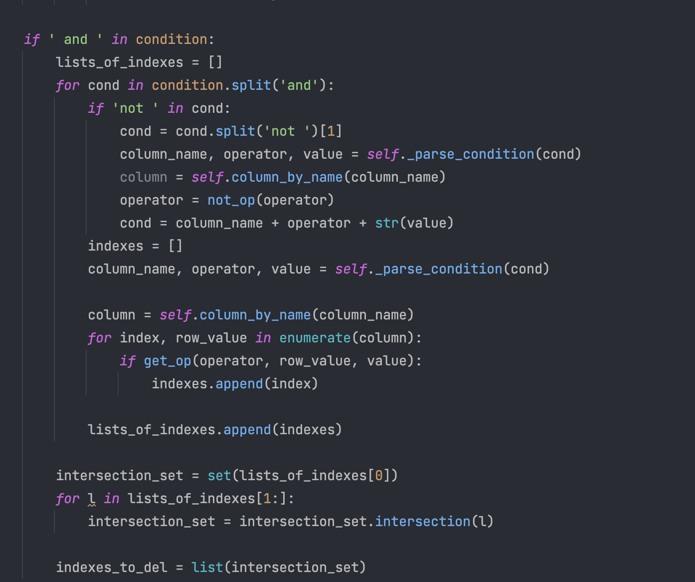 Σε περίπτωση που έχουμε and τότε πηγαίνουμε στο else κομμάτι όπου και υλοποιείται η διαδικασία για το and. Εδώ σπάμε την συνθήκη στο and, μαζεύουμε όλους τους δείκτες για την κάθε συνθήκη σε ξεχωριστές λίστες, ύστερα δημιουργούμε ένα σύνολο απο την τομή τους και εφαρμόζουμε το select.