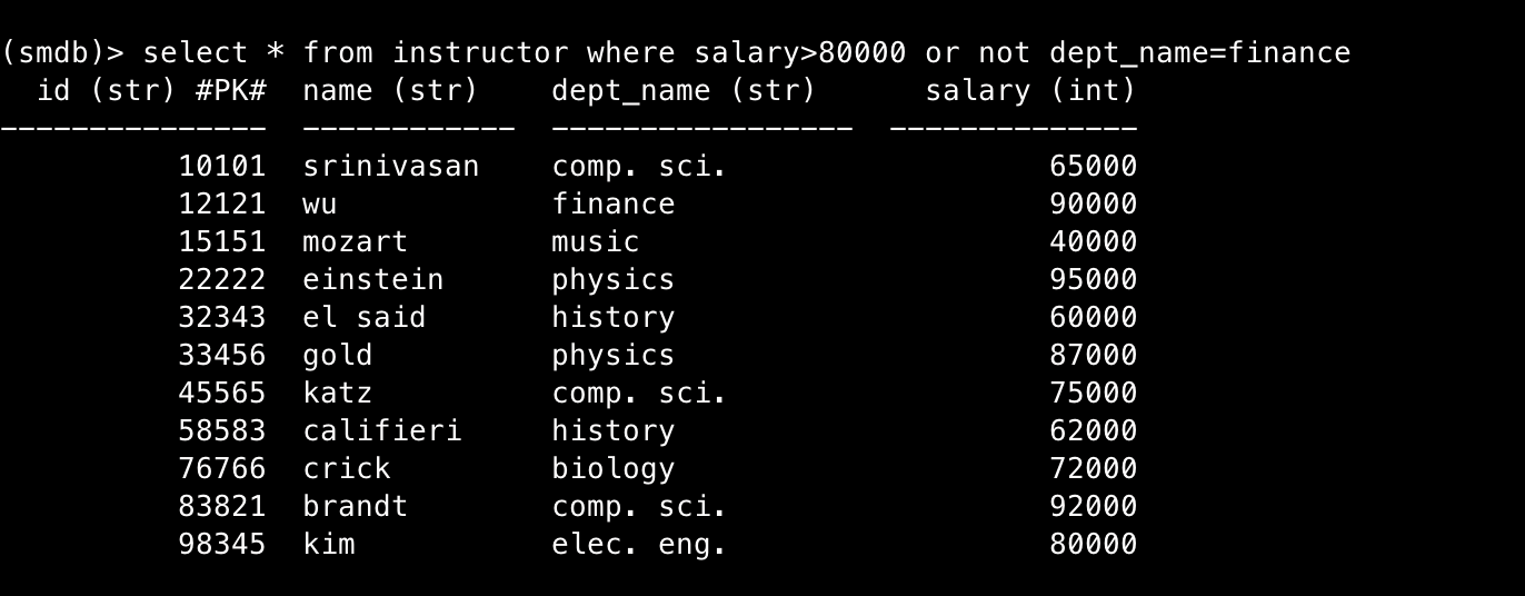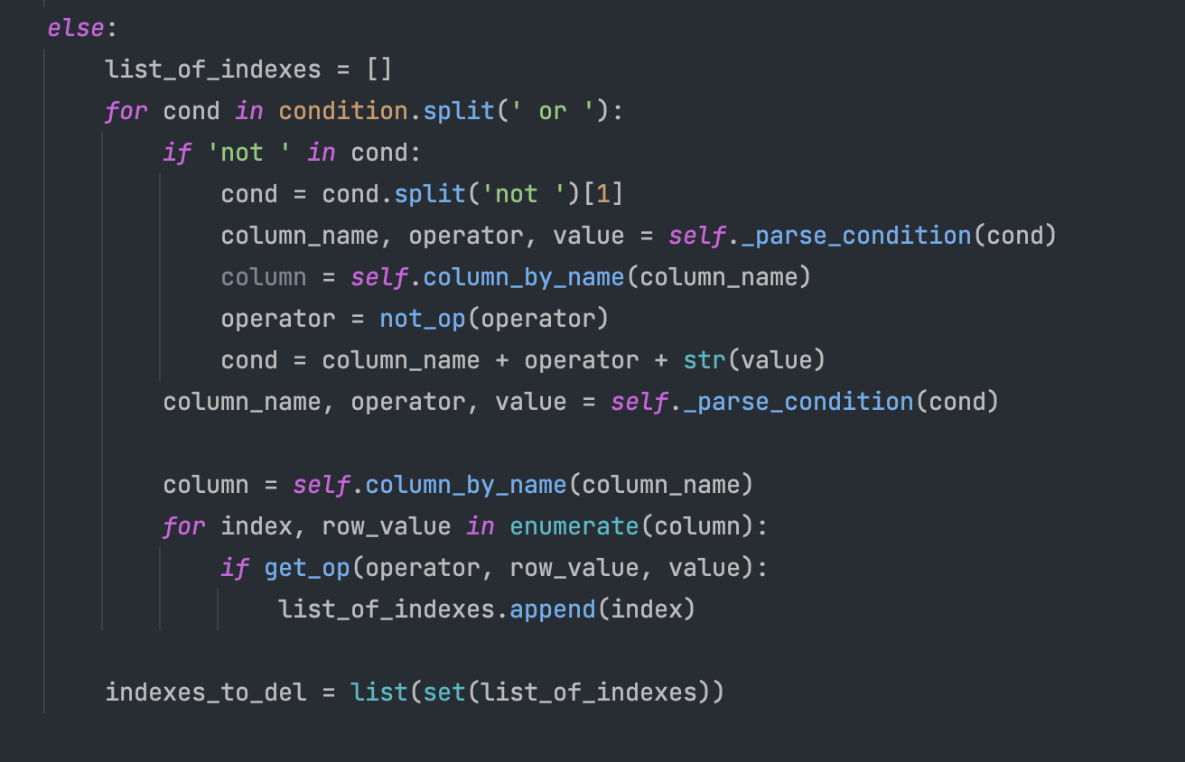 Στο select ελέγχουμε έαν το condition δεν περιέχει κάποιο ' and ' αν δεν περιέχει, τότε σπάμε το condition σε όποια or μπορεί να έχει. Αυτό γίνεται γιατί κατα το select μας ενδιαφέρει να μαζέψουμε όλους τους δείκτες που θα δείξουν στα δεδομένα μας, ανεξαρτήτως ποιά συνθήκη ικανοποιούν. Οπότε σε αυτό το block κώδικα ενσωματώνεται και το απλό condition ( ex. col_name = val ). Με αυτή την διαδικασία μαζεύουμε τους επιμέρους δείκτες για όλες τις ξεχωριστές συνθήκες και ύστερα κρατάμε την ένωση τους χωρίς τα duplicates.