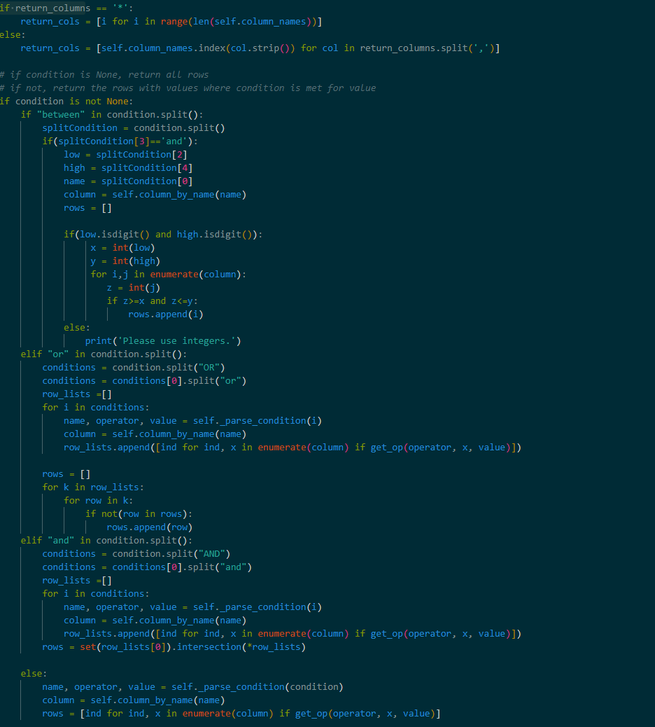 Οσον αφορα το between απομονωνω την καθε "τιμη" της εντολης μεσα σε μεταβλητες προκειμενου να τυπωθει το αποτελεσμα κανοντας ελεγχο δεξια και αριστερα του and ωστε να δεχεται το προγραμμα μονο αριθμους για να εκτελεστει σωστα το between. Αν ειναι τοτε προσθετω στον πινακα rows[] την τιμη της συνθηκης και εμφανιζεται μετα το τελος του if condition is not none.