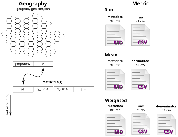 sum: The data is summed when polygons are selected. This will require ar<metric>.csv(old-style) or<metric>_numerator.csv(new-style) file.mean: The data is averaged when polygons are selected. This will require am<metric>.csv(classic) or<metric>_value.csv(new-style) file.weighted: A weighted average is calculated when polygons are selected. This requires the raw data inr<metric>.csv/<metric>_numerator.csvand a denominator for weighting/calculations ind<metric>.csv(classic) or<metric>_denominator.csv(new-style). r/d is each individual polygon value.