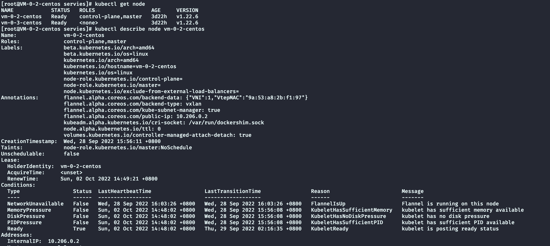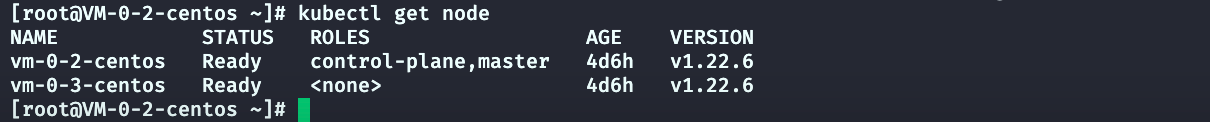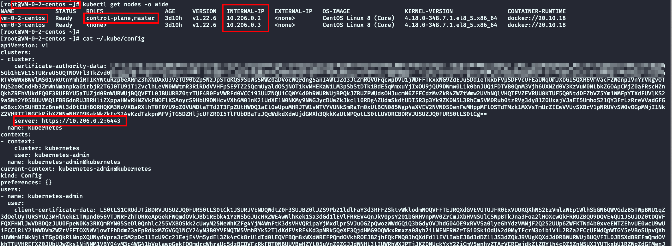图为腾讯云私有网络中部署的具有两个节点的 K8s 集群环境,对应主机名,发现 Master 节点正是运行 kubectl 工具的主机,Master 节点的 INTERNAL-IP 字段为腾讯云内网IP,与 kubectl 配置文件中 server 字段表示的 APIserver 服务IP一致,说明控制平面运行在 Master 节点上。