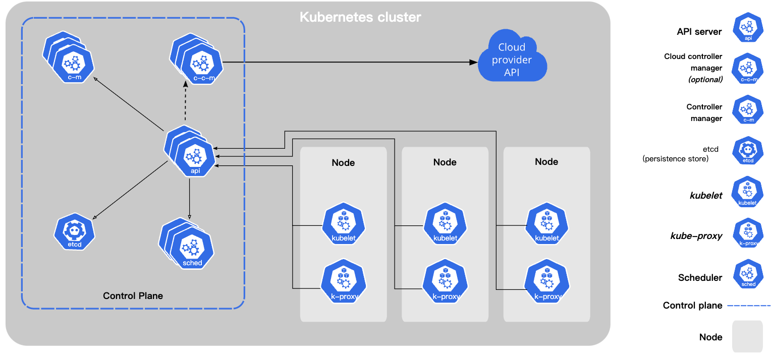 上边提到的 Node 跟控制平面,包含着 K8s 集群中的各种组件,一个正常运行的 K8s 集群所需的各种组件如下: