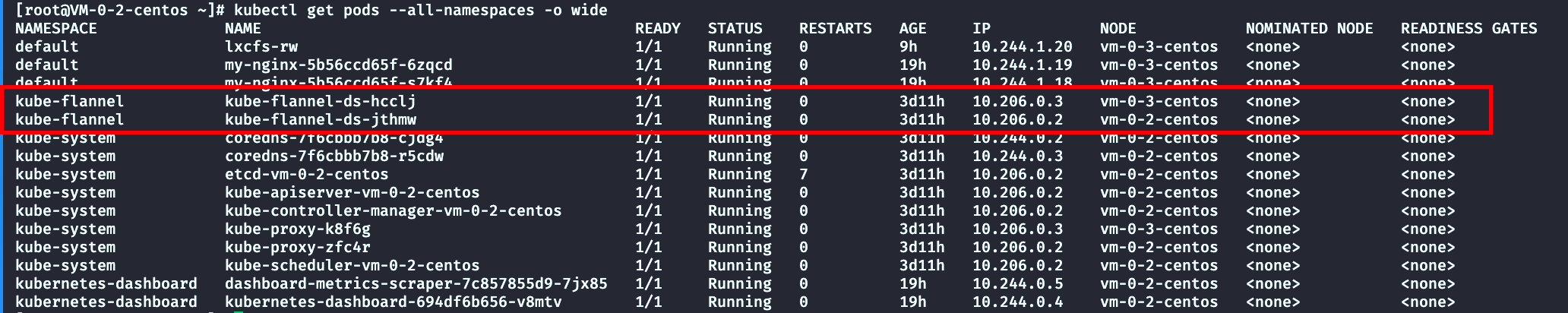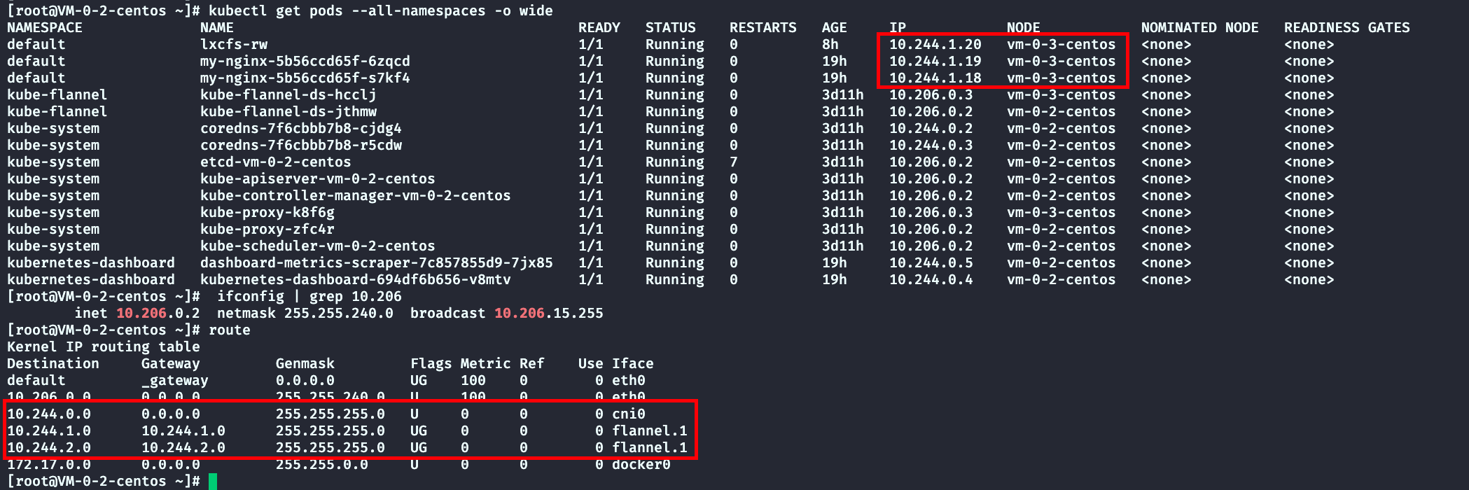如图在 vm-0-3-centos 节点上(10.206.0.3),存在3个Pod(10.244.1.18-20),每个Pod所分配的虚拟IP不同,这种网络是通过Flannel网络插件实现的,作为容器应用运行在节点上。